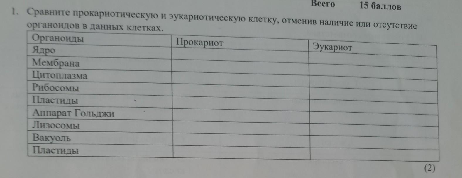 1. Сравните прокариотическую и эукариотическую клетку, отменив наличие или отсутствие органоидов в данных клетках. Органоиды Прокариот Эукариот Ядро Мембрана Цитоплазма Рибосомы Пластиды Аппарат Гольджи Лизосомы Вакуоль Пластиды (2)