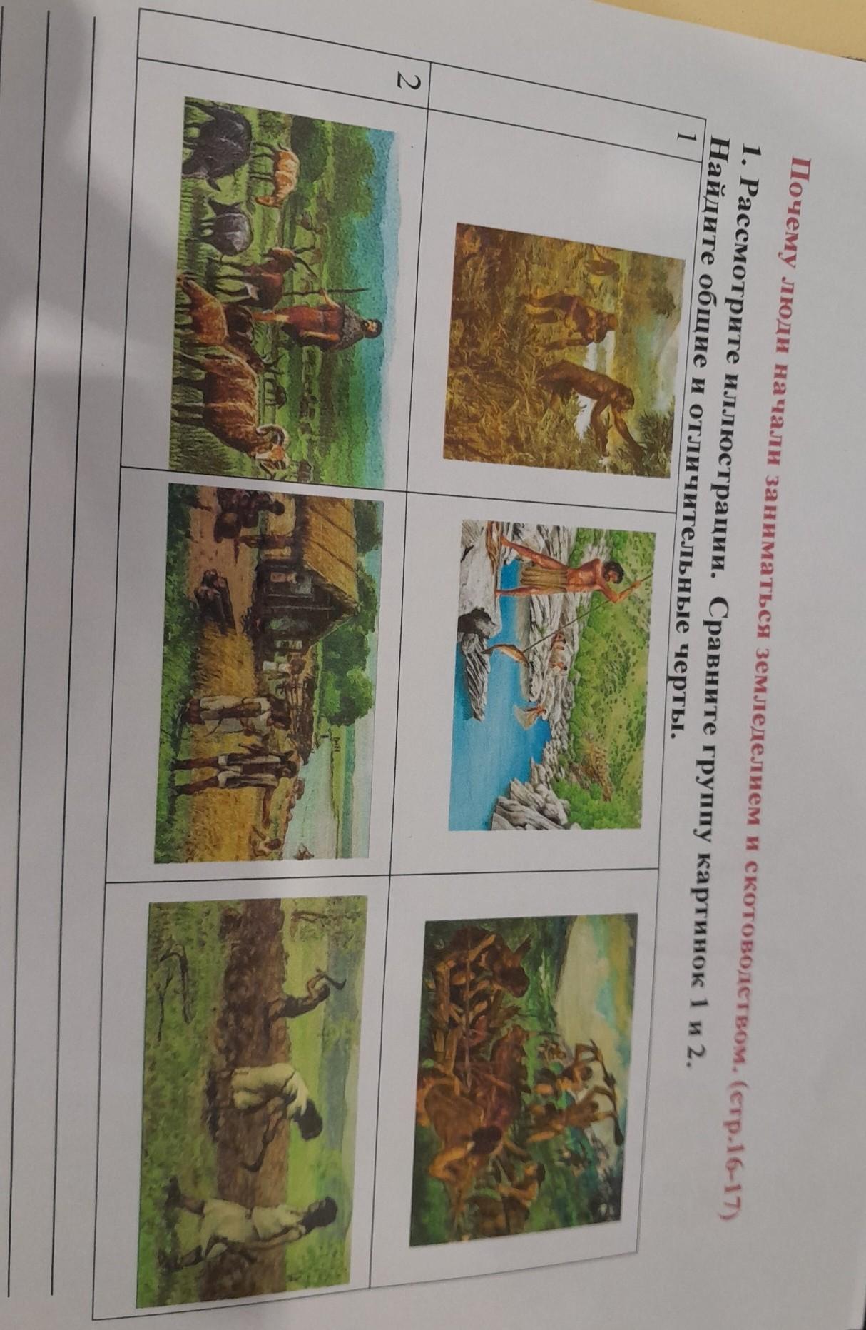 Почему люди начали заниматься земледелием и скотоводством. (стр.16-17) 1. Рассмотрите иллюстрации. Сравните группу картинок 1 и 2. Найдите общие и отличительные черты. 1 2 Е