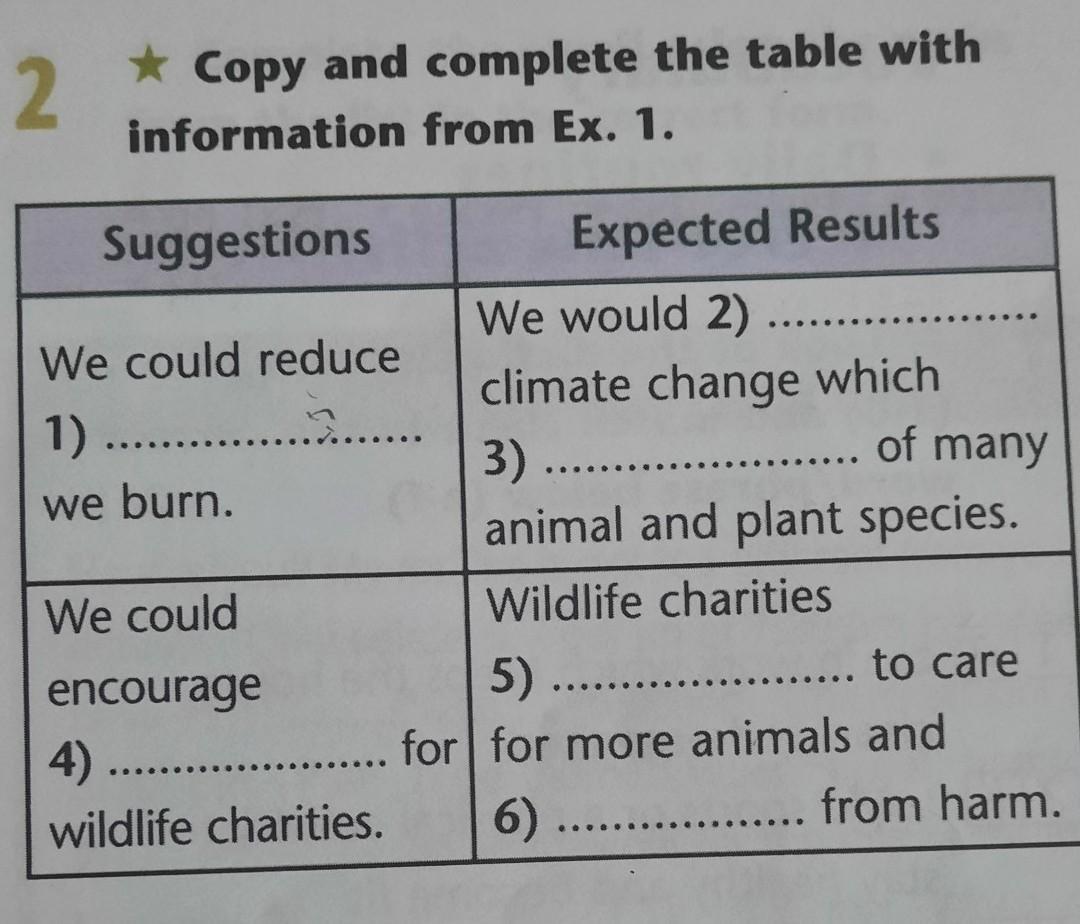2 * Copy and complete the table with information from Ex. 1. Suggestions We could reduce 1) ........................ we burn. We could encourage 4) wildlife charities. Expected Results We would 2) climate change which 3) .......... animal and plant species. Wildlife charities of many ... to care 5) .......... for for more animals and 6).......... from harm.