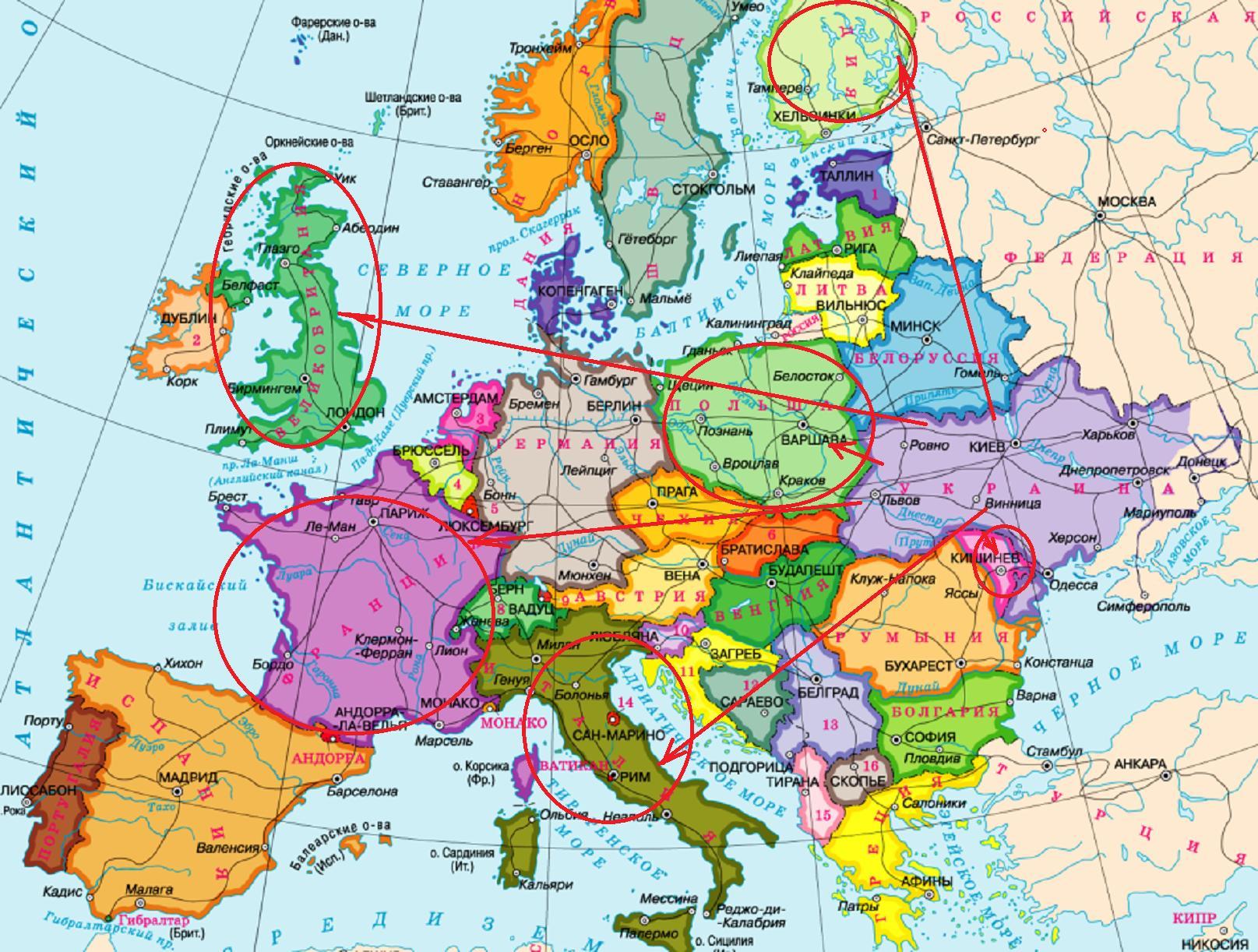 - Визначте, у якому напрямку від нашої держави розміщені такі країни: