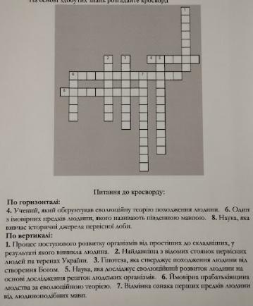 По вертикалі:1.Біологія.2.архантроп.3.Креацінізм.5.антрогенезом або антрогенезм.6.або в Східній Афріці або в Кенійської рифтової долини.7.У людини міцний колінний суглоб, стегнова кістка розташована під кутом усередину. У мавпистегнова кіска є під кутом назовні, а колінний суглоб не є міцним. У людини нижні кінцівки є довшими за передні, а у мавпи — навпаки))