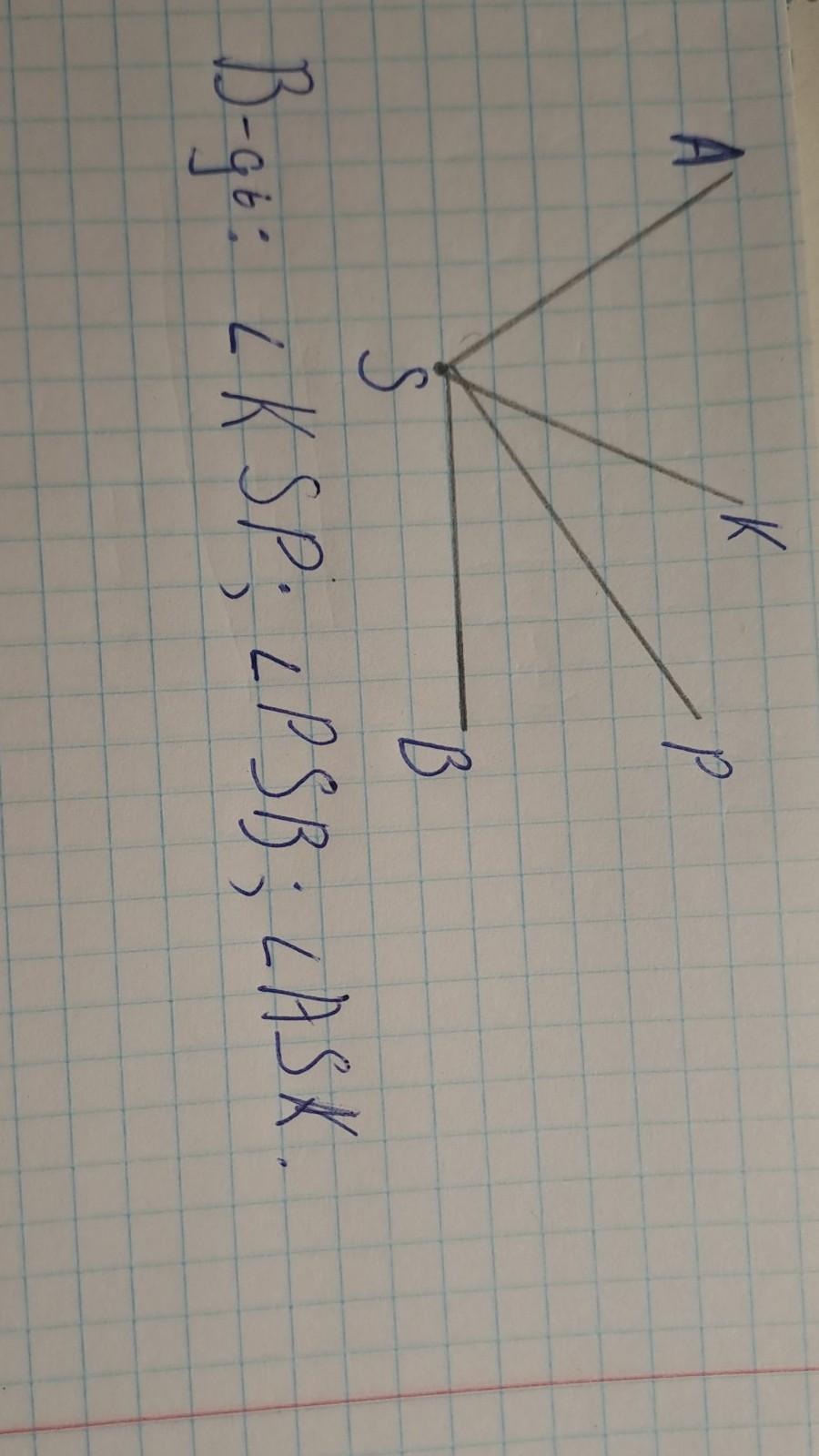 1. Накресліть кут ASB і проведіть променi SK i SP мiж його сторонами. Запишіть 3 кути, що при цьому утворились