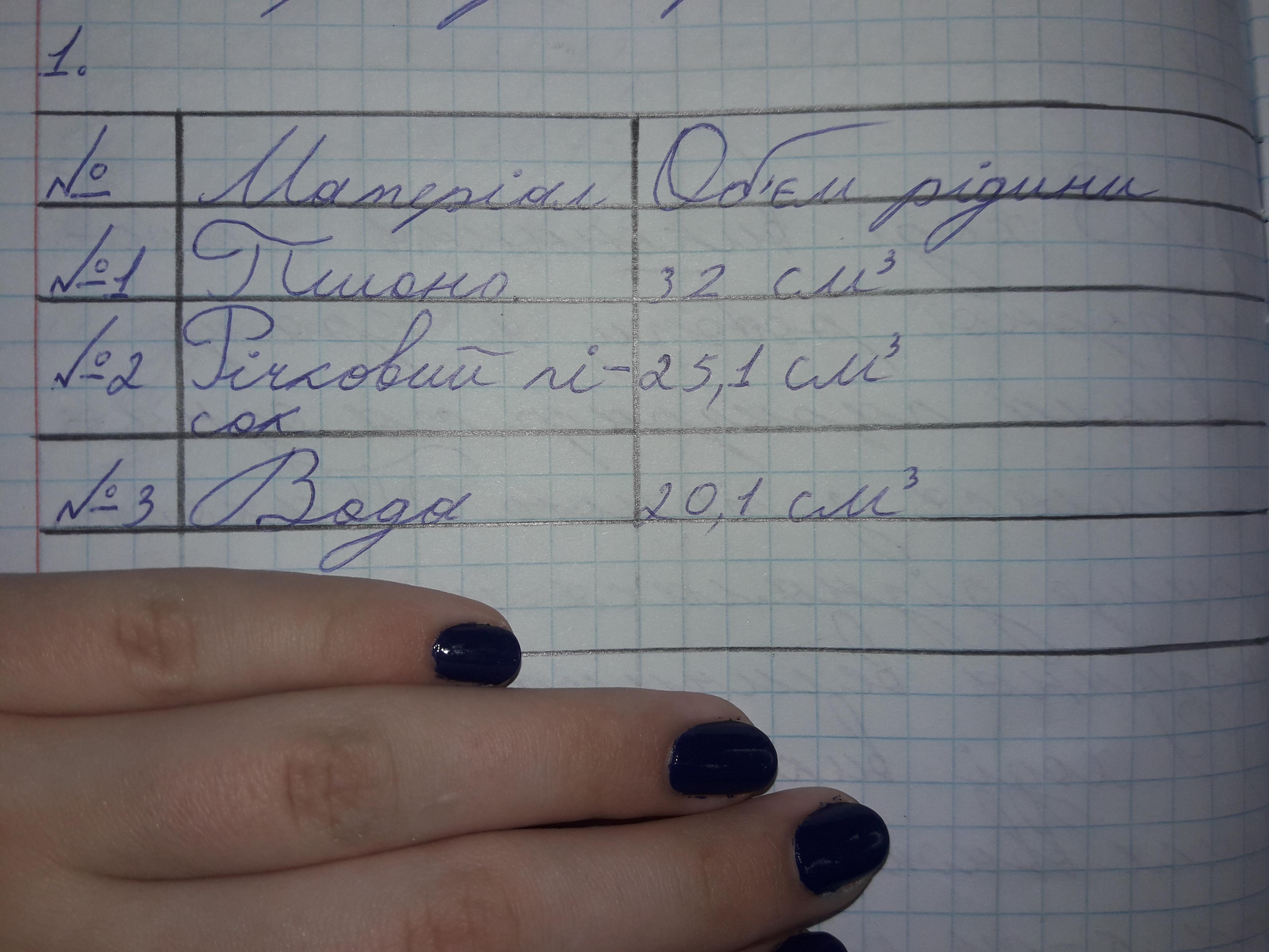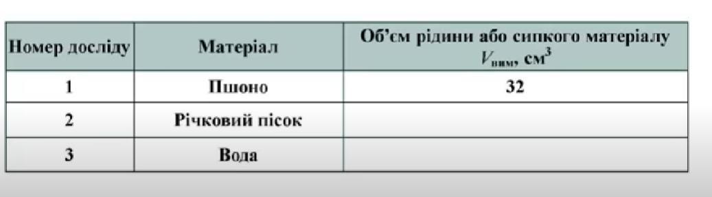 Номер досліду Матеріал Об'єм рідини або матеріалу ∨вим,см³