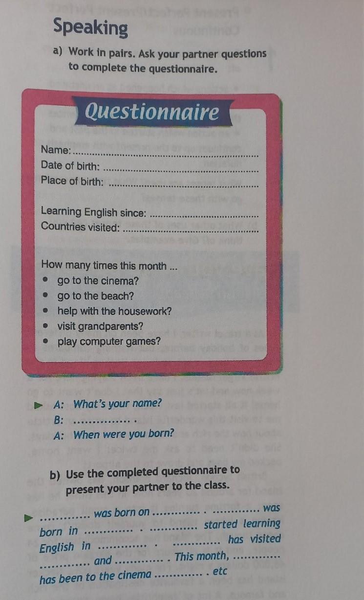 Speaking a) Work in pairs. Ask your partner questions to complete the questionnaire. Questionnaire Name:... Date of birth: Place of birth: Learning English since: Countries visited: How many times this month... ● go to the cinema? • go to the beach? • help with the housework? • visit grandparents? • play computer games? ► A: What's your name? B: A: When were you born? b) Use the completed questionnaire to present your partner to the class. was born on born in ............ English in and. has been to the cinema was started learning has visited This month, etc ...........