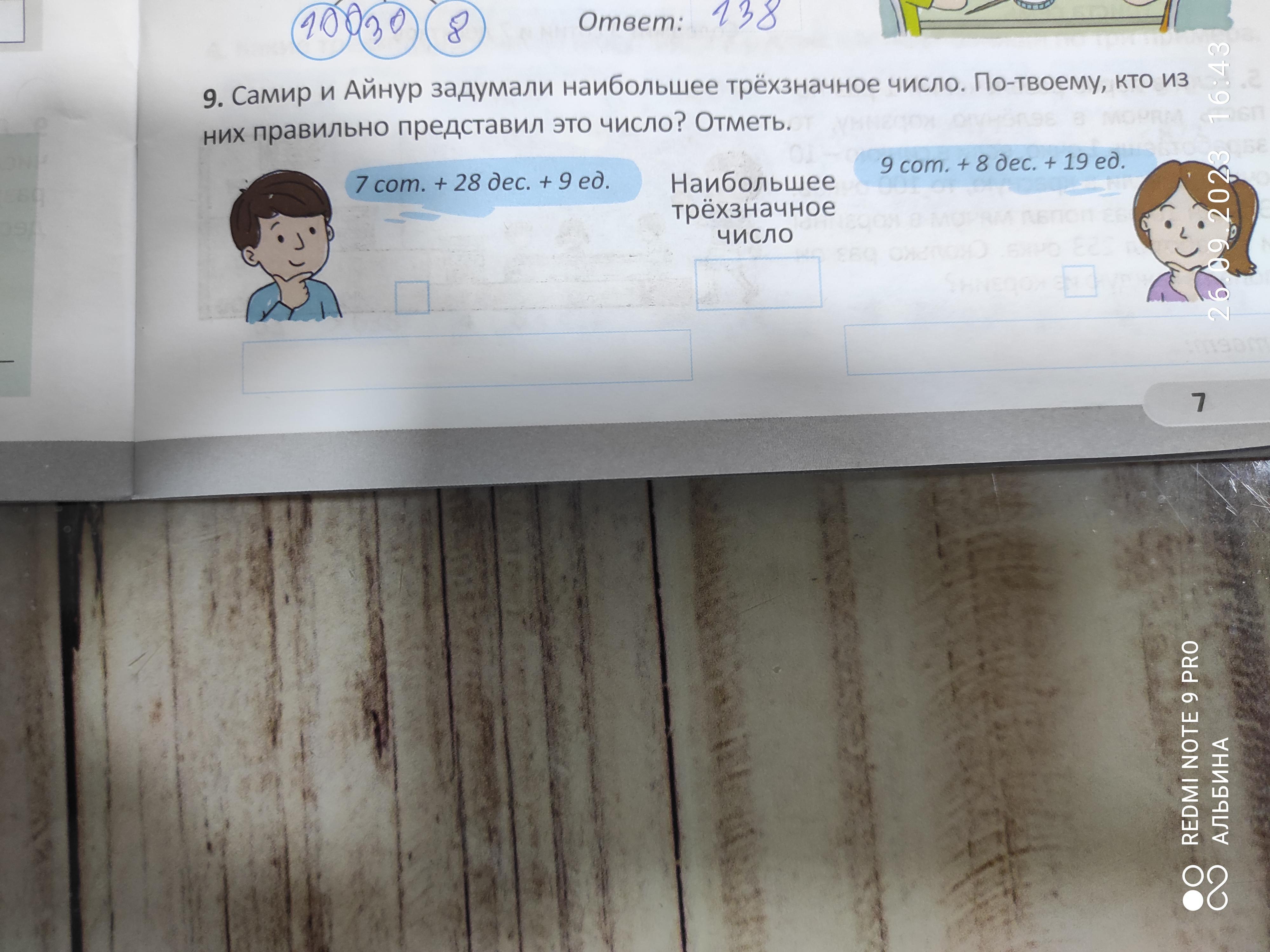 Самир и Айнура задумали наибольшее трёхзначное число.По-твоему,кто из них правильно представил это число? Отметь.