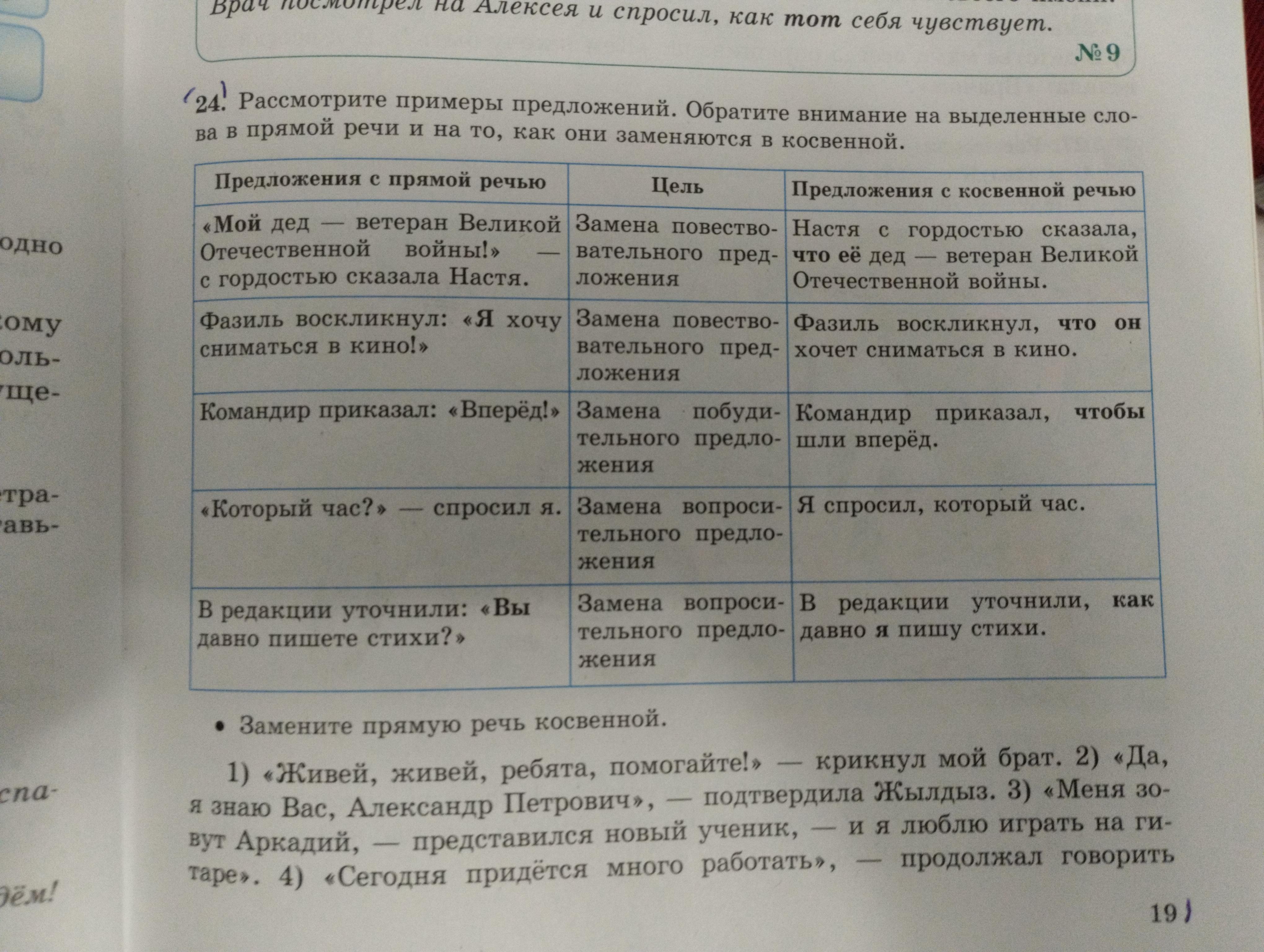 24. Рассмотрите примеры предложений. обратите внимание на выделенные слова в прямой речи и на то, как они заменяются в косневой.