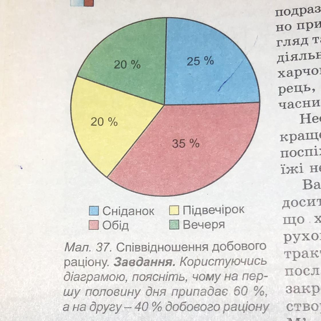 поясніть, чому на першу половину дня припадає 60%, а на другу - 40% добового раціону