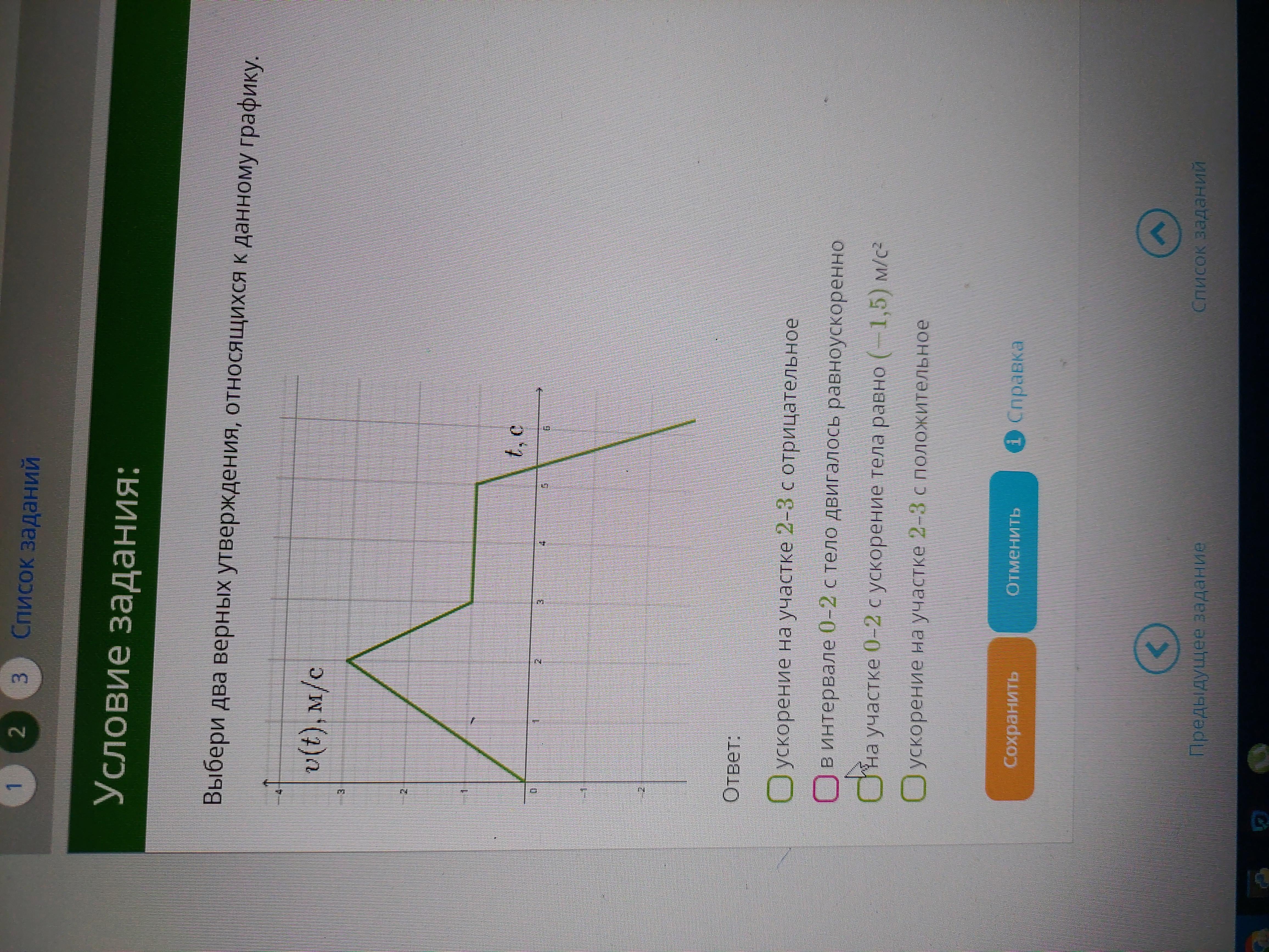 ускорение на участке 2-3 отрицательное (график опускается вниз)