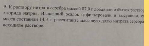 К раствору нитрата серебра массой 87,0 г добавили избыток раствор хлорида натрия. Выпавший осадок отфильтровали и высушилн. е масса составили 14,3 г. рассчитайте массовую долю нитрата серебра Исходном растворе.