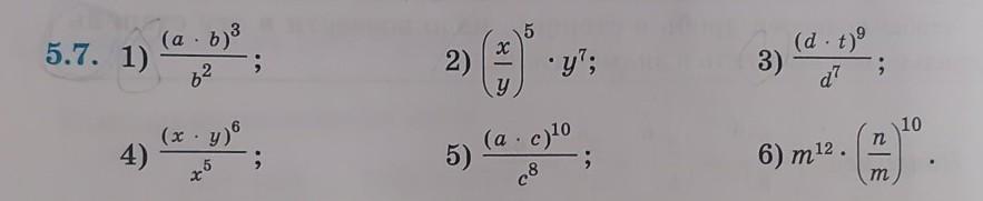 5.7. 1) 4) (a - b)° 6² (x - y) ; 2) 5) .y²; y (a. c)¹0 c8 ; 3) (d. t)⁹ d² 6) m ¹2. n m 10