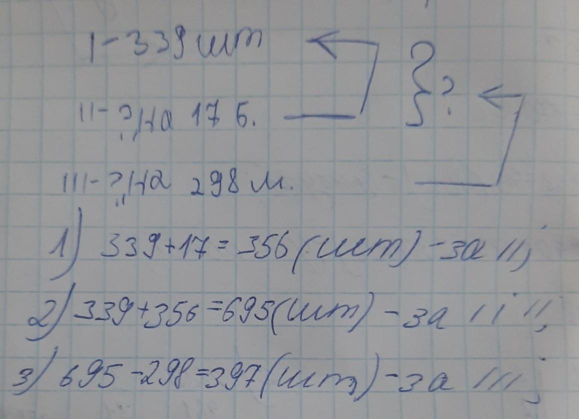 3. Тракторний завод за перший місяць випустив 339 тракторів, за другий - на 17 більше, а за третій - на 298 менше, ніж за пер- ший і другий місяці разом. Скільки тракторів випустив завод за третій місяць?