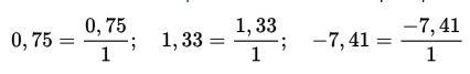 - Переписать исходную дробь в виде новой дроби: в числителе останется исходная десятичная дробь, а в знаменателе нужно поставить единицу. При этом знак исходного числа также помещается в числитель. Например: (рисунок 1)