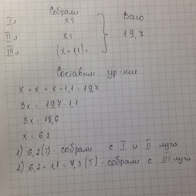 с трёх лугов собрали 19,7 тонн сена. С первого и второго лугов собрали сена поровну , а с третьего на 1,1 тонн больше , чем с каждого из первых двух .