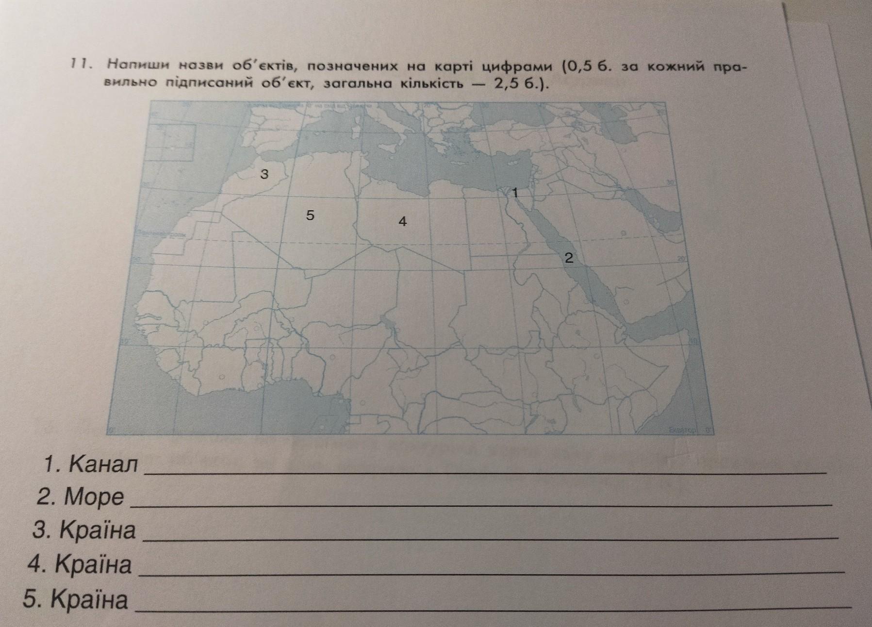 Ответ:1.Суецький канал. 2.Червоне море. 3.Марокко. 4.Алжир. 5.Лівія