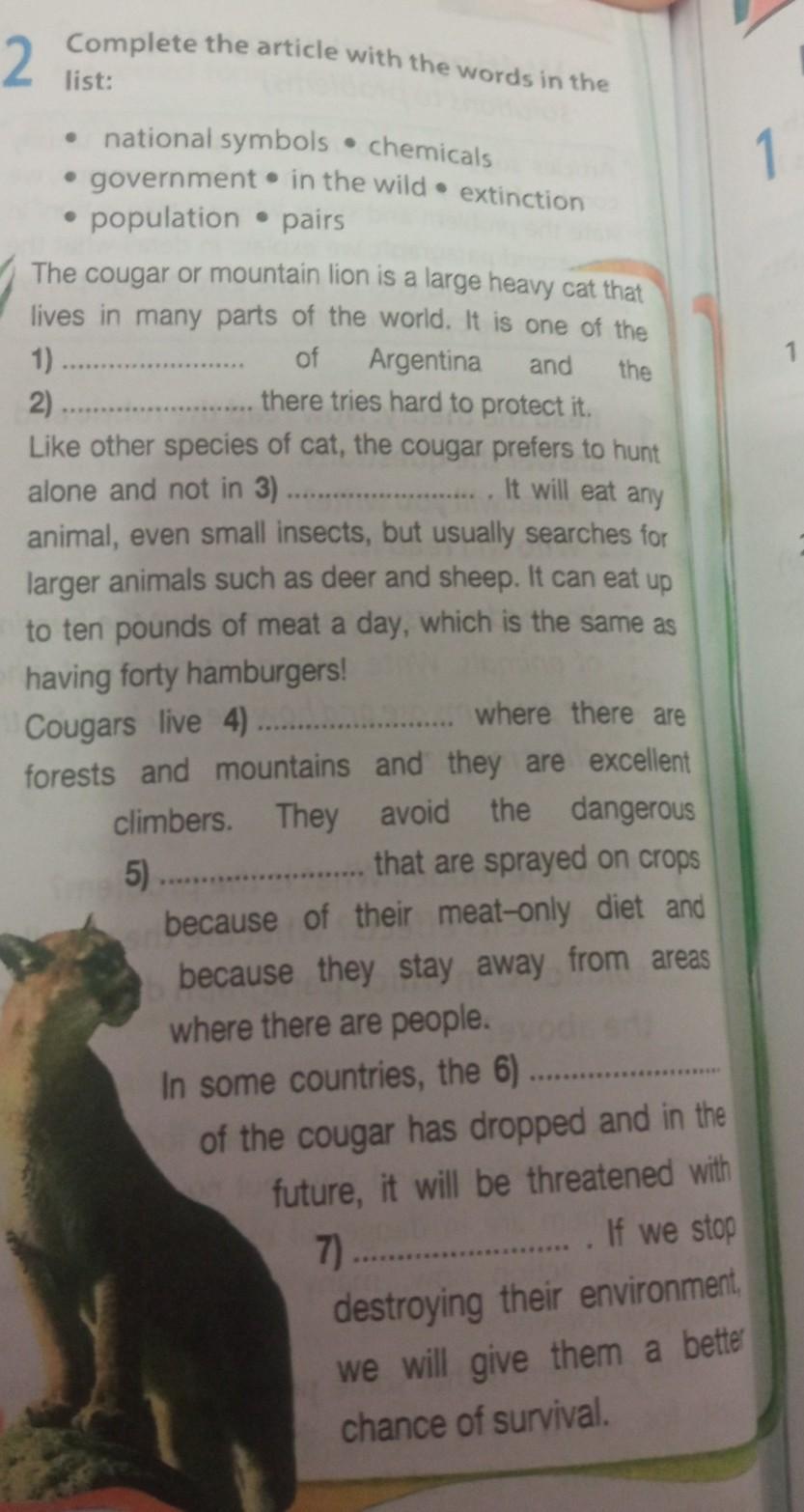 2 Complete the article with the words in the list: • national symbols • chemicals • government in the wild • extinction population pairs The cougar or mountain lion is a large heavy cat that lives in many parts of the world. It is one of the of Argentina and the 1) 2). .... there tries hard to protect it. Like other species of cat, the cougar prefers to hunt alone and not in 3)... It will eat any animal, even small insects, but usually searches for larger animals such as deer and sheep. It can eat up to ten pounds of meat a day, which is the same as having forty hamburgers! where there are Cougars live 4) forests and mountains and they are excellent climbers. They avoid the dangerous 5)..... that are sprayed on crops because of their meat-only diet and because they stay away from areas where there are people. In some countries, the 6) of the cougar has dropped and in the future, it will be threatened with ...... If we stop 7).. destroying their environment, we will give them a better chance of survival.