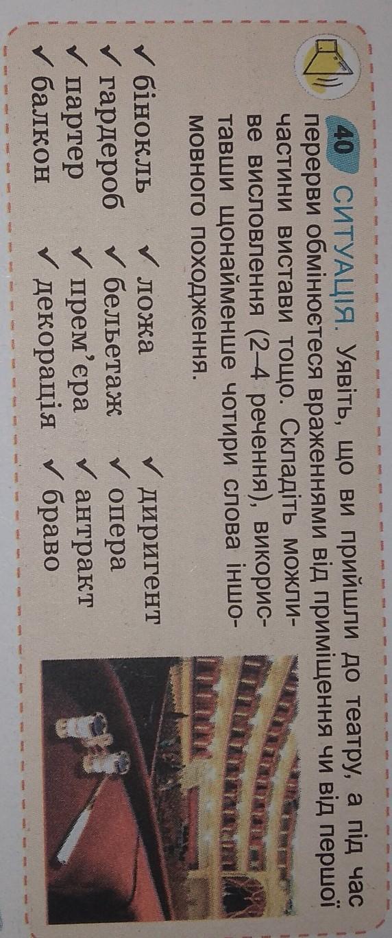 Слова іншомовного походження: диригент,декорації,балкони,бінокль,партнер.