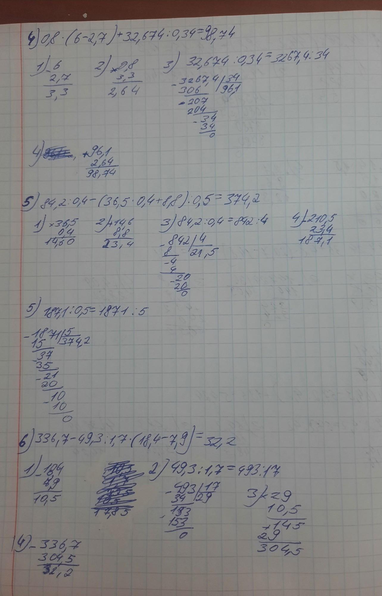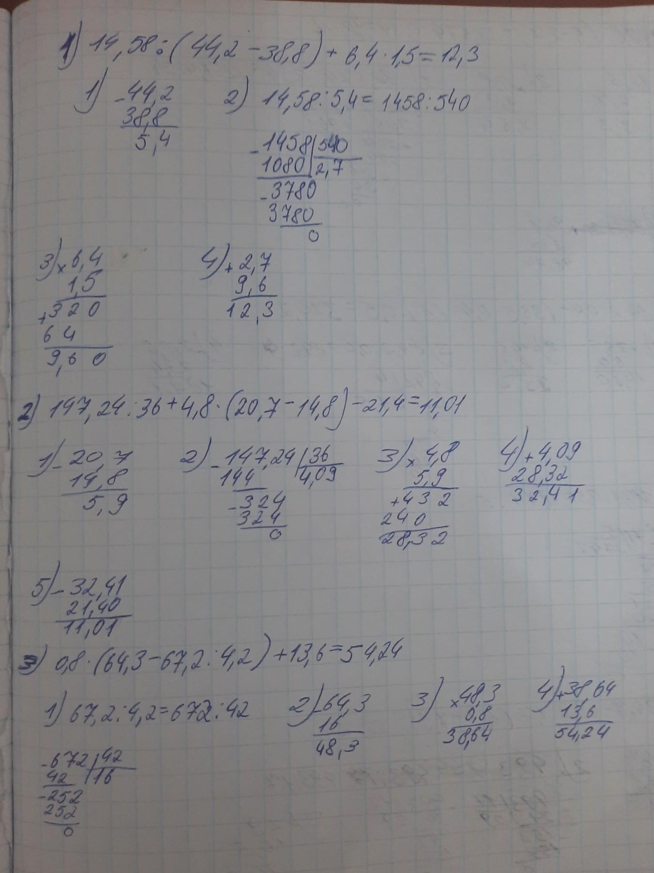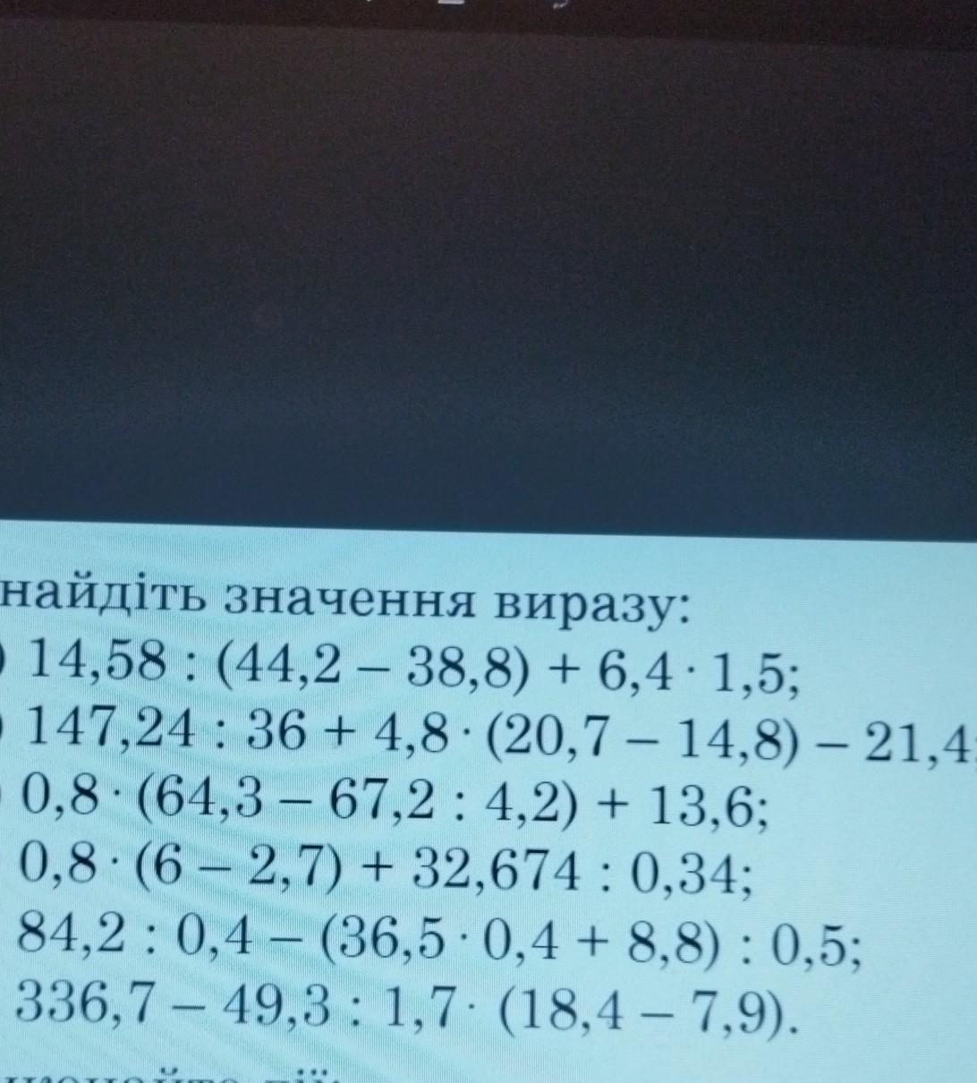 1341. Знайдіть значення виразу: 1) 14,58: (44,2 - 38,8) + 6,4 1,5; 2) 147,24: 36 + 4,8 (20,7 - 14,8) - 21,4; 3) 0,8 (64,367,2 : 4,2) + 13,6; 4) 0,8 (6-2,7) + 32,674: 0,34; 5) 84,2 0,4 - (36,5 0,4 +8,8): 0,5; 6) 336,7 - 49,3 : 1,7 (18,4-7,9). *