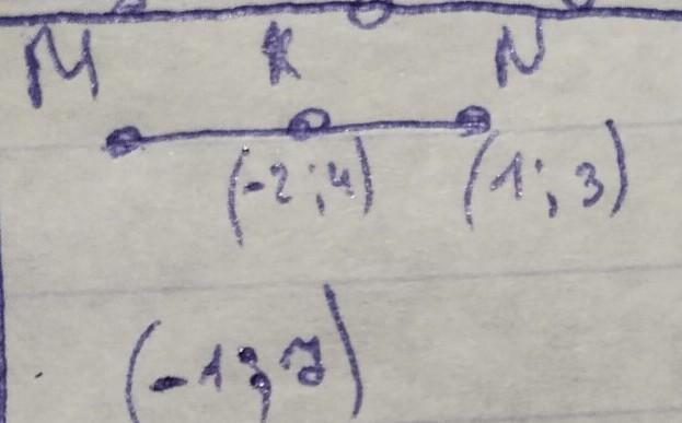 пусть М(х; у), тогда для середины N и концов отрезка М и К можно записать: 1 = (х - 2)/2, 3 = (у + 4)/2.
