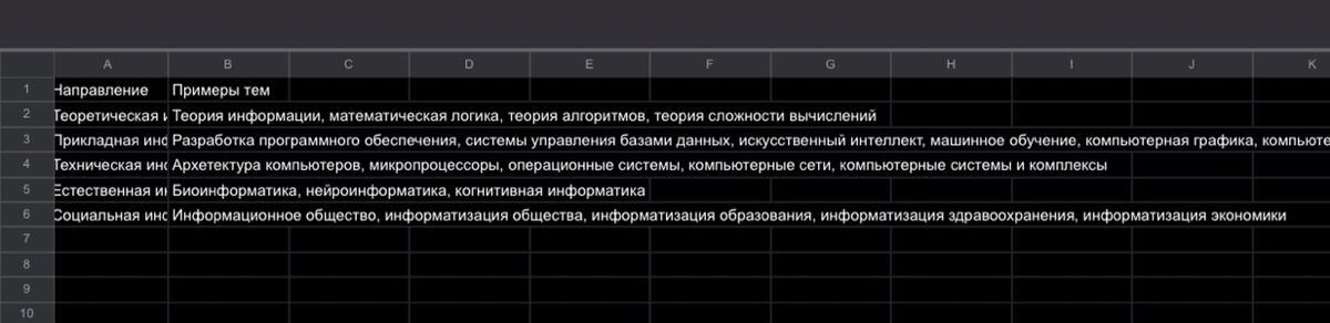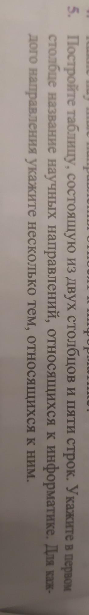 Сропнооо!!! Даю 20 баллов. Постройте таблицу, состоявшую из двух столбцов и пяти строк. Укажите в первом столбце названия научных направлений, относящихся к информатике. Для каждого направления укажите несколько тем, относящихся к ним.