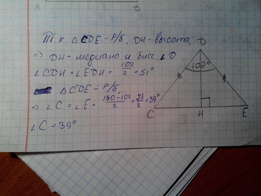 В равнобедренном треугольнике CDE с основанием CE и угол D = 102 градуса проведена высота H. Найти угол DCH.нарисовать рисунок и решить. СРОЧНО НАДО НА ЗАВТРА.