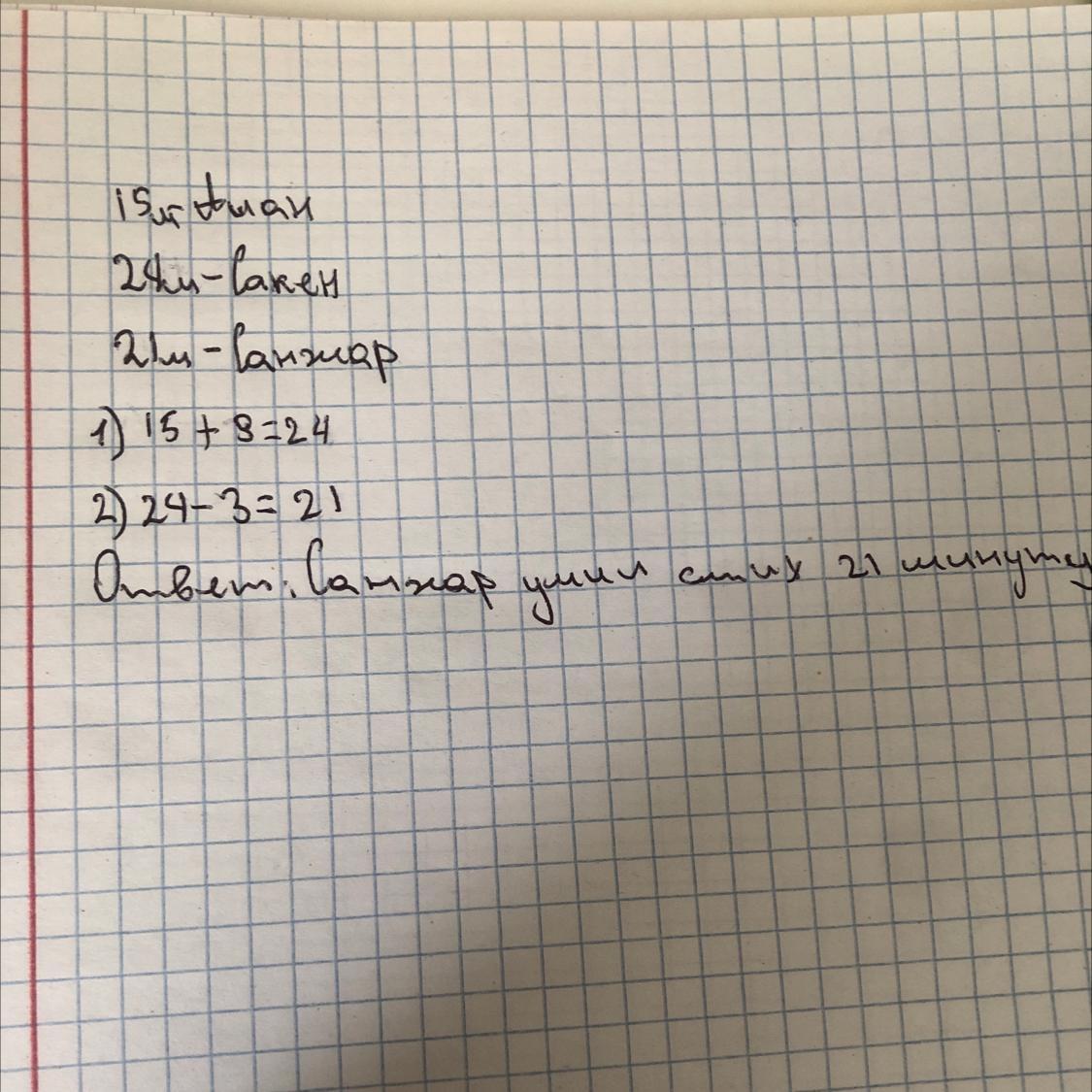 Алану понадобилось 15 минут.Сакену-на 9 минут больше а Санжар учил на 3 минут меньше,чем Сакен.Сколько времени понадобилось Санжару?