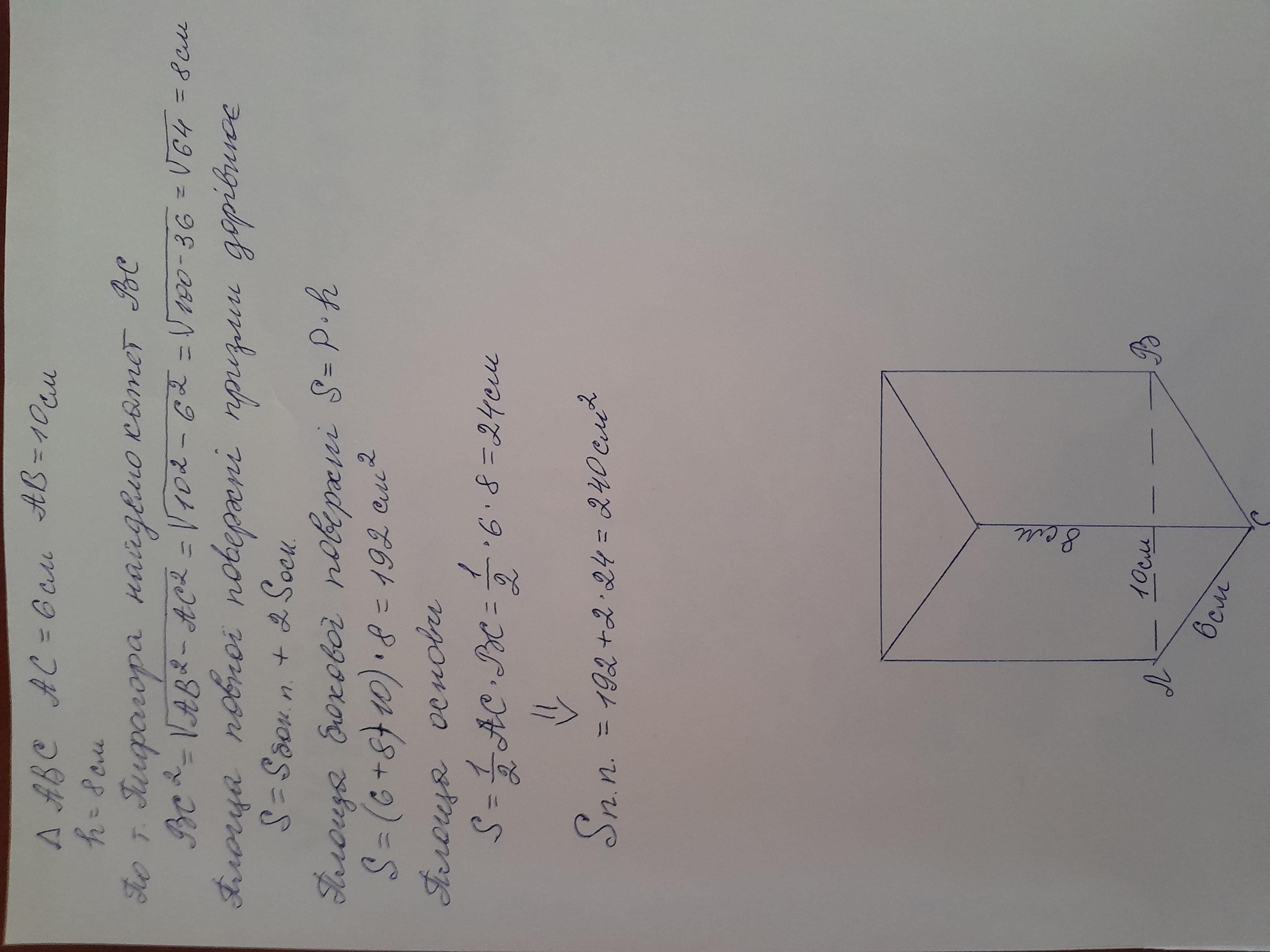 Основою прямої призми є прямокутний трикутник, гіпотенуза якого 10 см, а один з катетів 6 см. Знайдіть площу повної поверхні призми, якщо її висота дорівнює 8 см.