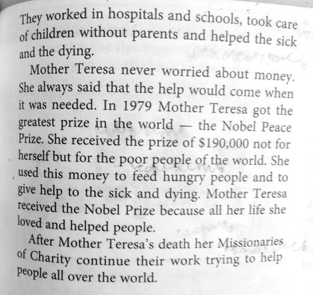 In 1979 Mother Teresa got the Nobel Pease Prize. She used all the money she got for homeless, poor, sick people.
