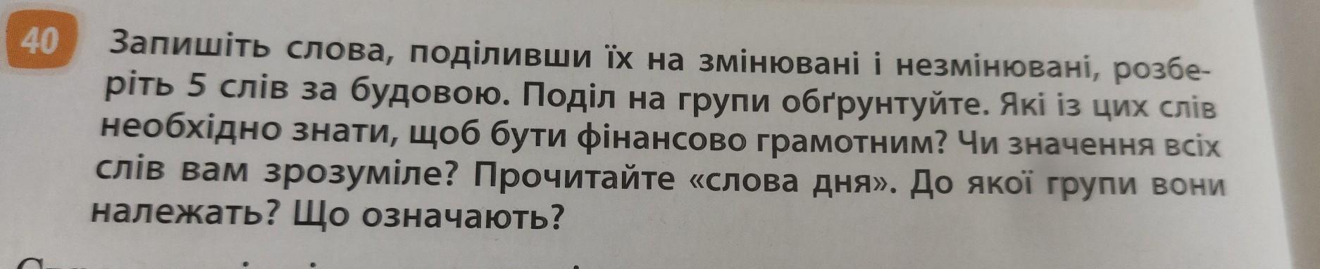 40. Запишіть слова, поділивши їх на змінювані і незмінювані, розбе- ріть 5 слів за будовою. Поділ на групи обгрунтуйте. Які із цих слів необхідно знати, щоб бути фінансово грамотним? Чи значення всіх слів вам зрозуміле? Прочитайте «слова дня». До якої групи вони належать? Що означають?