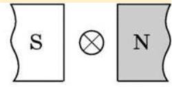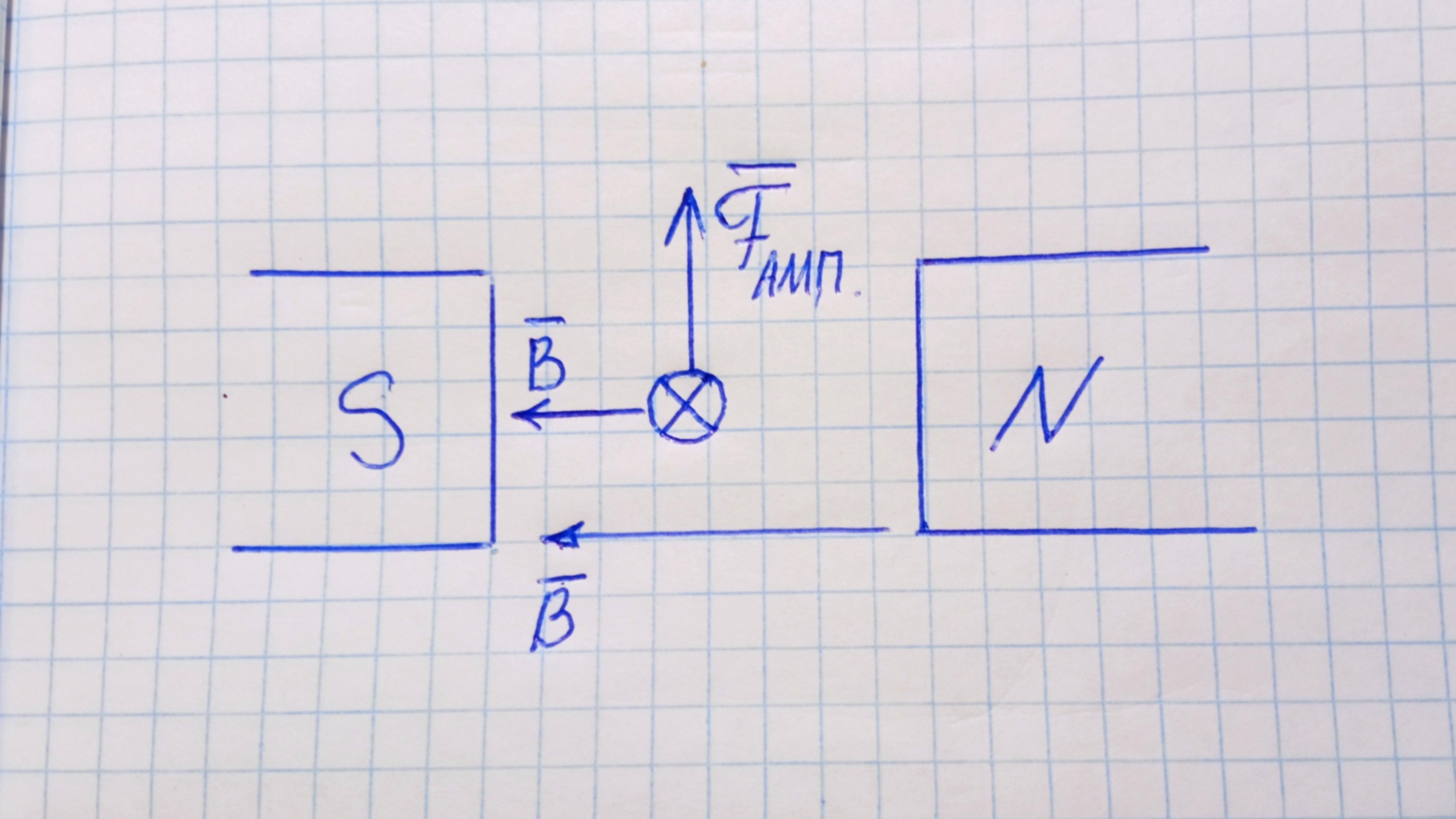 Лінії магнітного поля виходять з Північного полюса N і йдуть ліворуч. В долоню лівої руки. Струм йде від нас. 4 пальця направимо від нас. Тоді великий відігнутий палець покаже напрямок сили Ампера вгору.