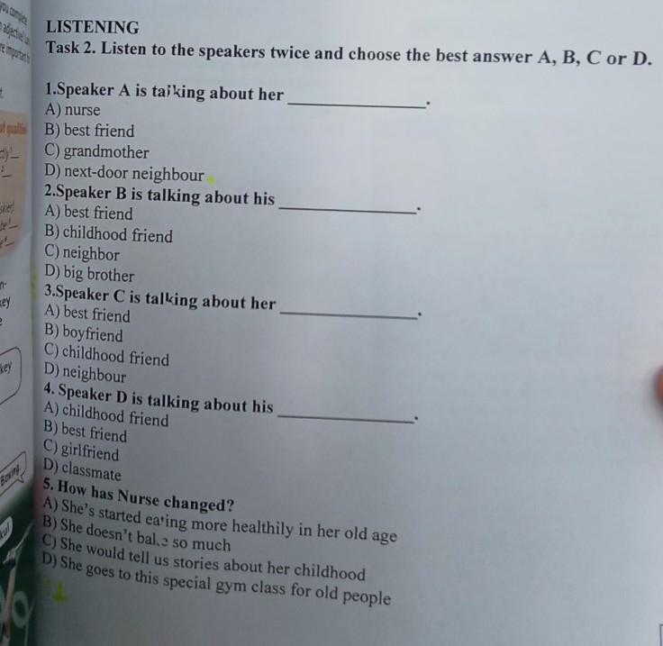 Task 2. Listen to the speakers twice and choose the best answer A, B, C or D. 1.Speaker A is talking about her A) nurse B) best friend C) grandmother D) next-door neighbour 2.Speaker B is talking about his A) best friend B) childhood friend C) neighbor D) big brother