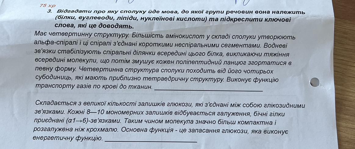 Відгадати про яку сполуку йде мова, до якої групи речовин вона належить (білки, вуглеводи, ліпіди, нуклеїнові кислоти) та підкреслити ключові слова, які це доводять.