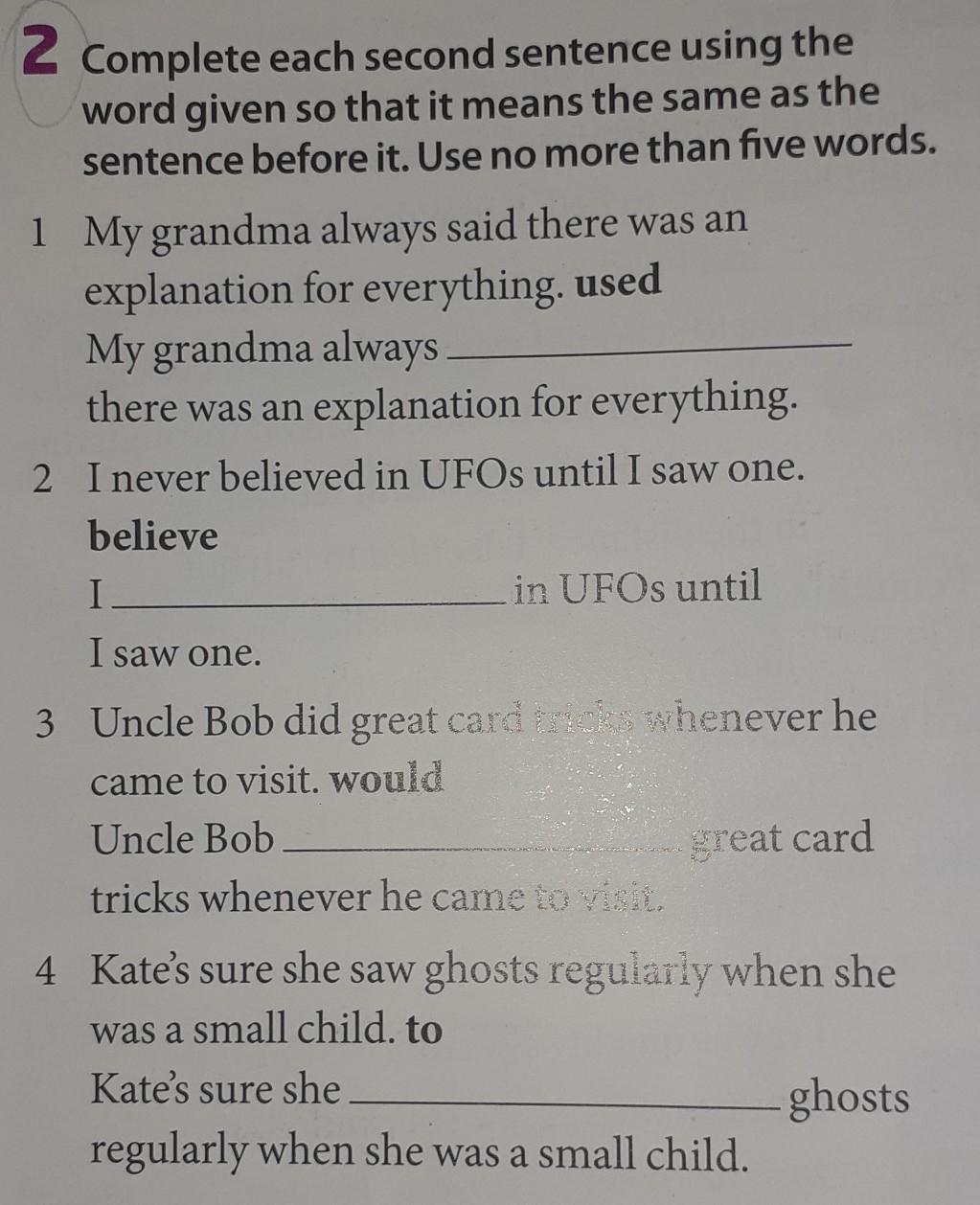 2 Complete each second sentence using the word given so that it means the same as the sentence before it. Use no more than five words. 1 My grandma always said there was an explanation for everything. used My grandma always there was an explanation for everything. 2 I never believed in UFOs until I saw one. believe I. I saw one. in UFOs until 3 Uncle Bob did great card tricks whenever he came to visit. would Uncle Bob tricks whenever he came to visit. great card 4 Kate's sure she saw ghosts regularly when she was a small child. to Kate's sure she ghosts regularly when she was a small child.