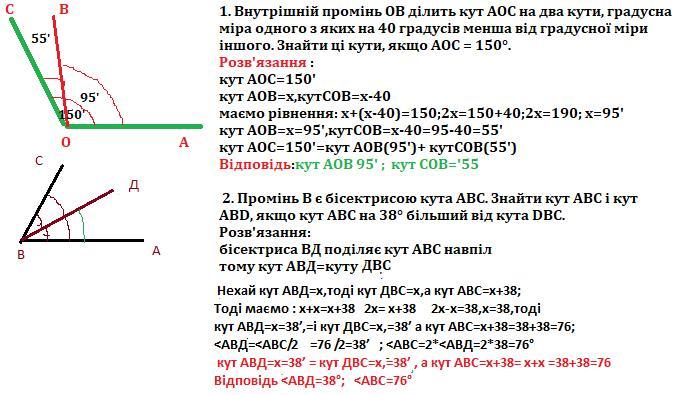 1. Внутрішній промінь ОВ ділить кут АОС на два кути, градусна міра одного з яких на 40 градусів менша від градусної міри іншого. Знайти ці кути, якщо АОС = 150°. 2. Промінь В є бісектрисою кута АВС. Знайти кут АВС і кут ABD, якщо кут АВС на 38° більший від кута DBC.