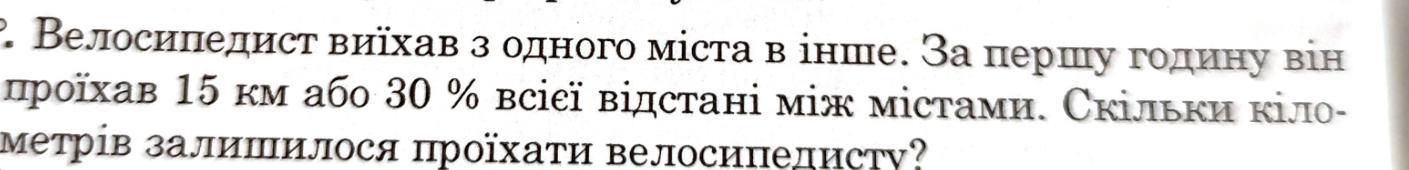 7. Велосипедист виїхав з одного міста в інше. За першу годину він проїхав 15 км або 30% всієї відстані між містами. Скільки кіло- метрів залишилося проїхати велосипедисту