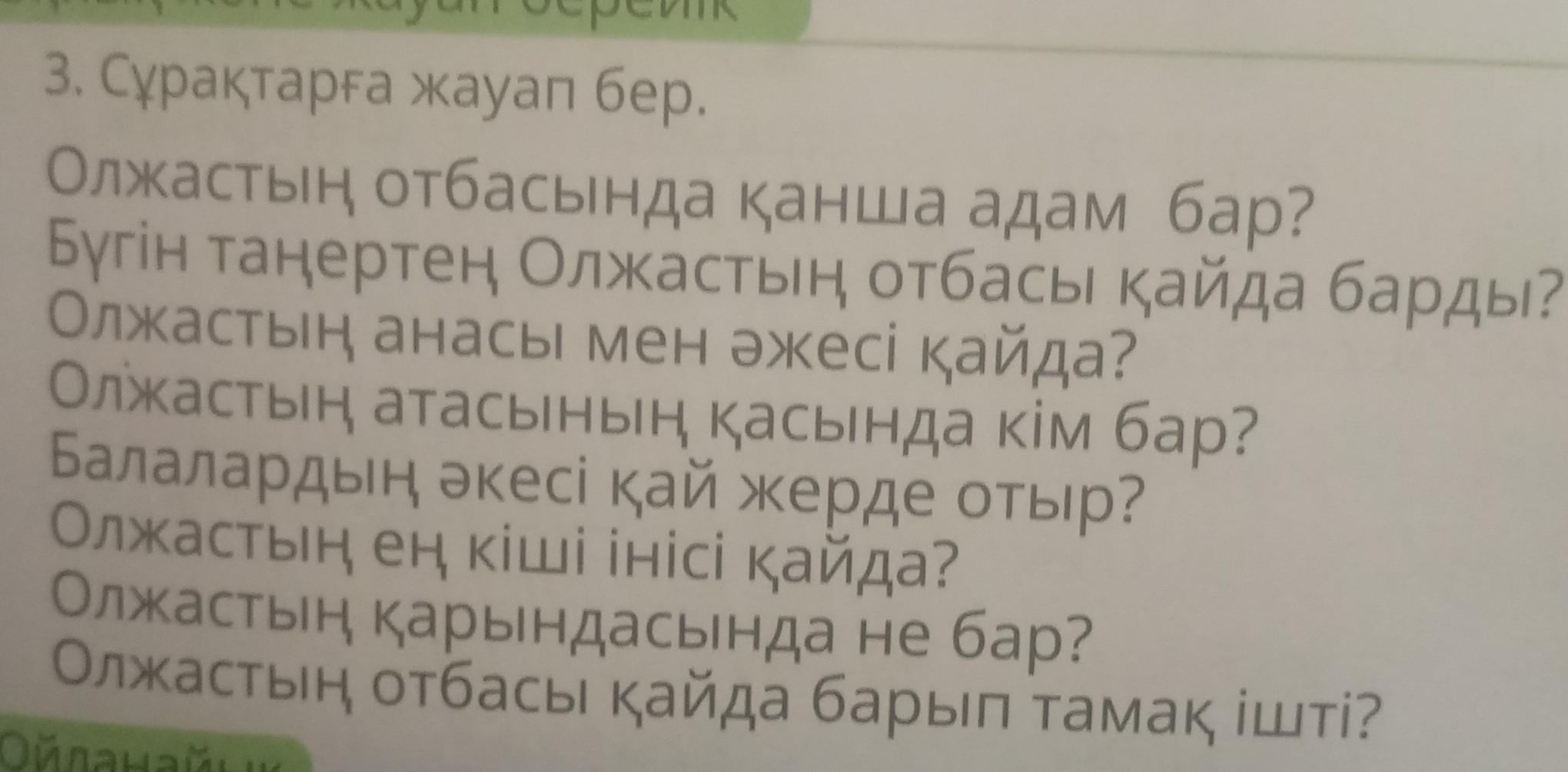 Оқиық және жауап берейік 3. Сұрақтарға жауап бер. Олжастың отбасында қанша адам бар? Бүгін таңертең Олжастың отбасы қайда барды? Олжастың анасы мен әжесі қайда? Олжастың атасының қасында кім бар? Балалардың әкесі қай жерде отыр? Олжастың ең кіші інісі қайда? Олжастың қарындасында не бар? Олжастың отбасы қайда барып тамақ ішті?