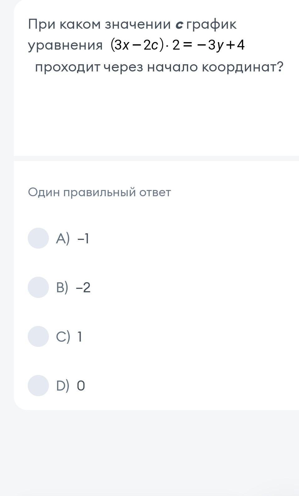 При каком значении с график уравнения (3x-2c). 2=-3y+4 проходит через начало координат? Один правильный ответ A) -1 B) -2 С) 1 D) помогите пожалуйста