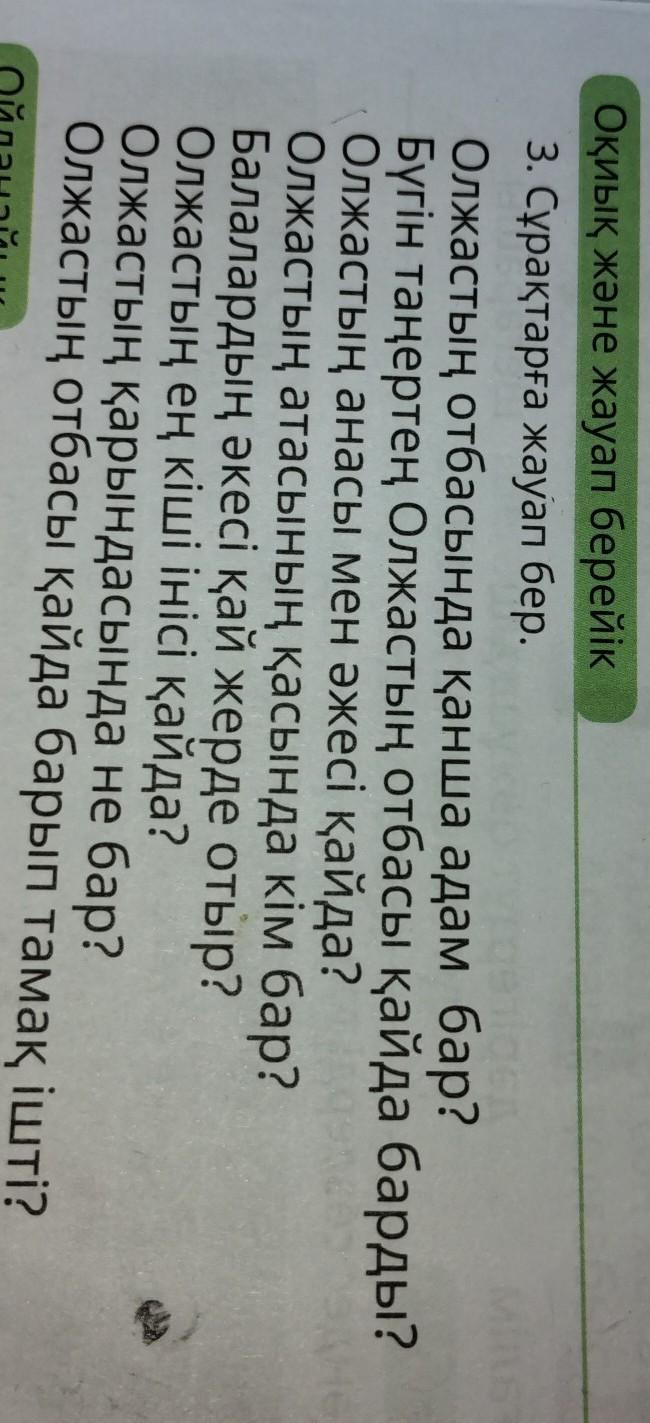 3. Сұрақтарға жауап бер. Олжастың отбасында қанша адам бар? Бүгін таңертең Олжастың отбасы кайда барды? Олжастың анасы мен әжесі қайда? Олжастың атасының қасында кім бар? Балалардың әкесі қай жерде отыр? Олжастың ең кiшi iнiсi қайда? Олжастың қарындасында не бар? Олжастың отбасы қайда барып тамақ ішті? помогите срочно