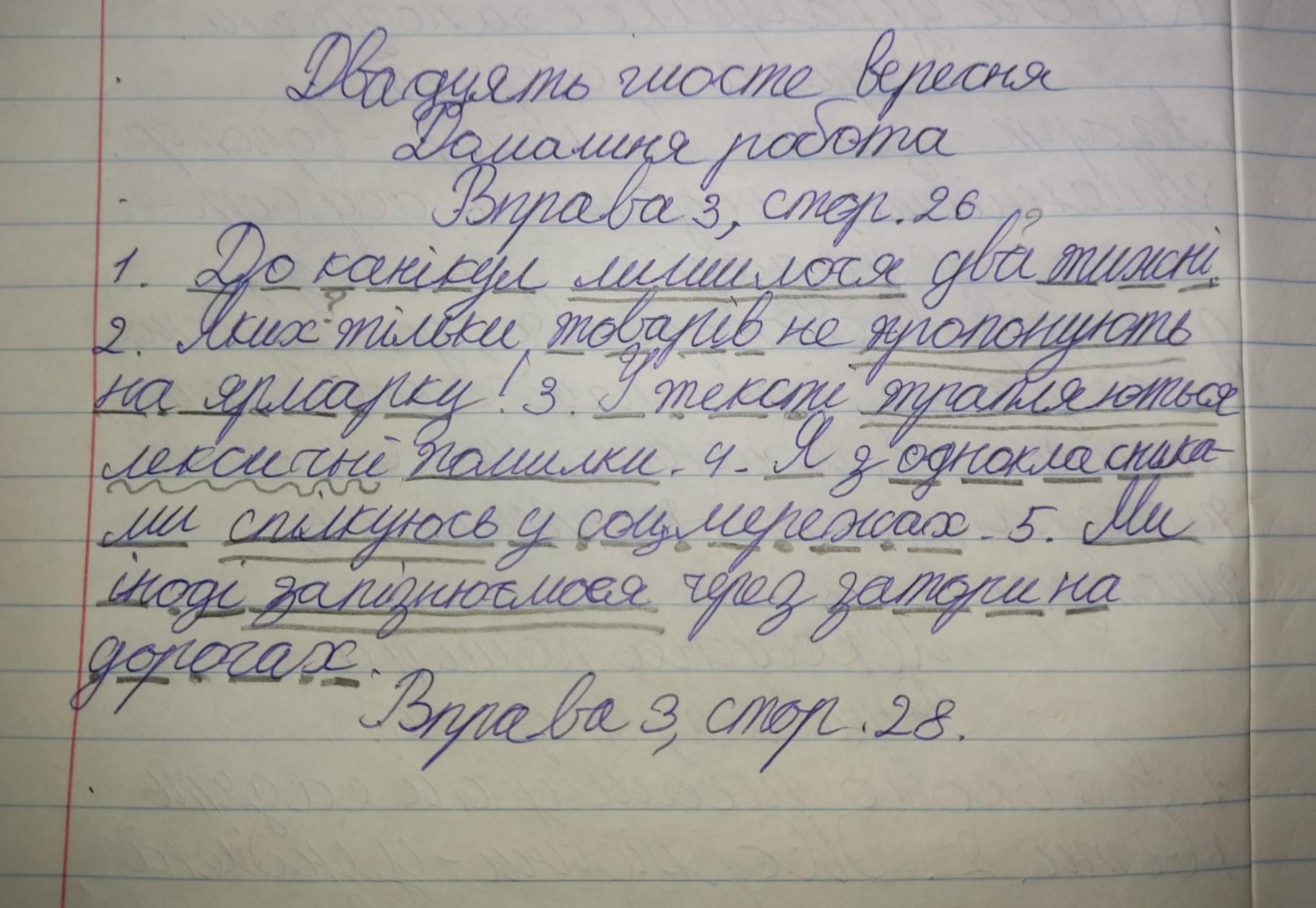 3. Вiдредагуйте речення та запишіть їх. Підкресліть у них головні й друго- рядні члени. 1. До канікул лишилося дві неділі. 2. Яких тільки товарів не предлага- ють на ярмарку! 3. У тексті зутрічаються лексичні помилки. 4. Я з одно- класниками переписуюся в соцмережах. 5. Ми іноді запізнюємося через пробки на дорогах.