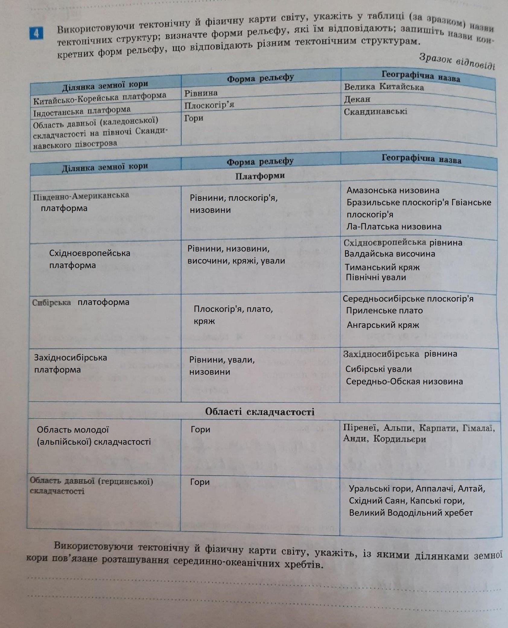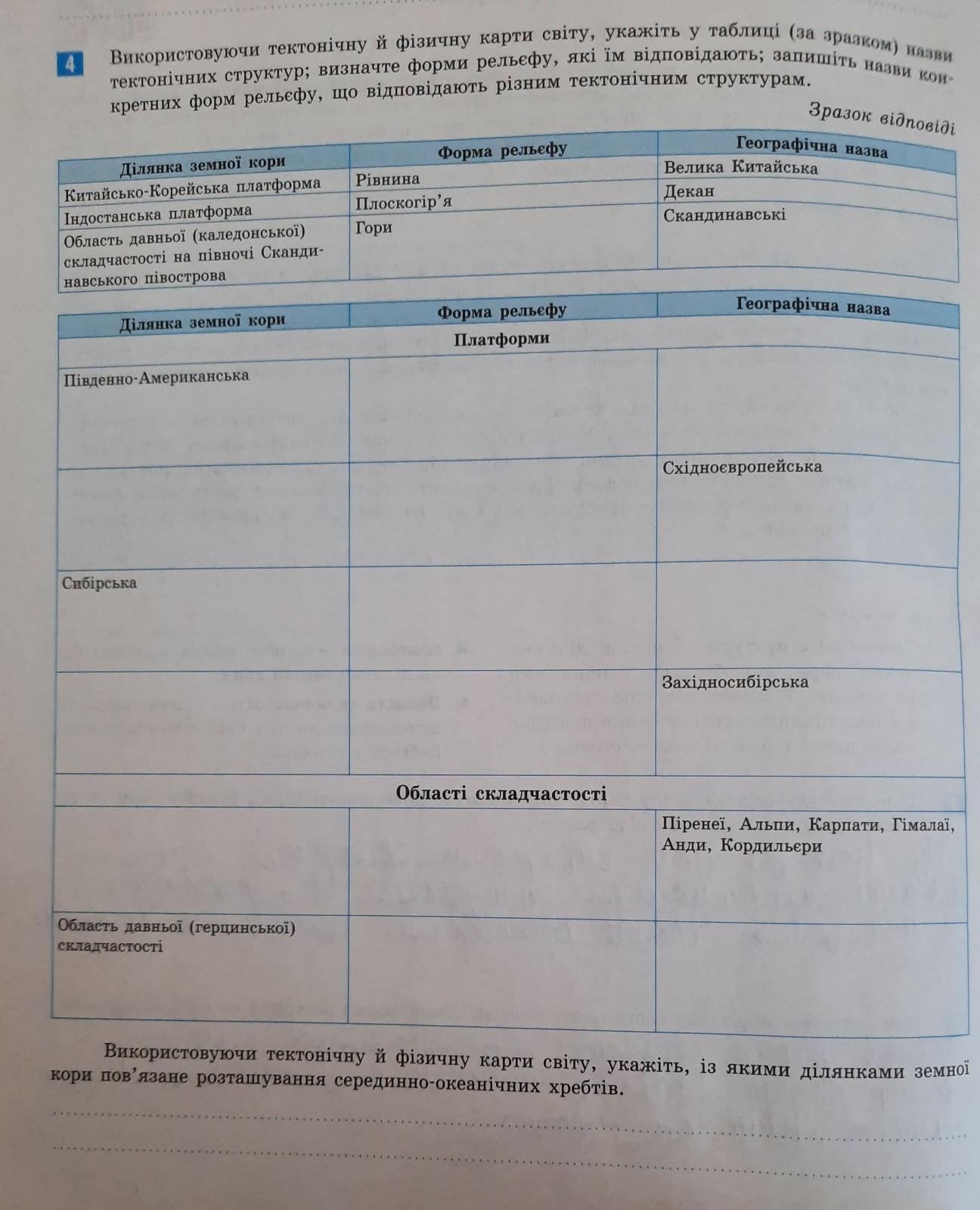 тектонічних структур; форми рельєфу, які їм відповідають; запишіть назви кои Використовуючи тектонічну й фізичну карти світу, укажіть у таблиці (за зразком) назви кретних форм рельєфу, що відповідають різним тектонічним структурам. Ділянка земної кори Китайсько-Корейська платформа Індостанська платформа Область давньої (каледонської) складчастості на півночі Сканди- навського півострова Ділянка земної кори Південно-Американська Сибірська Область давньої (герцинської) складчастості Форма рельефу Рівнина Плоскогір'я Гори Форма рельефу Платформи Областi складчастості Зразок відповіді Географічна назва Велика Китайська Декан Скандинавські Географічна назва Східноєвропейська Західносибірська Піренеї, Альпи, Карпати, Гімалаї, Анди, Кордильери