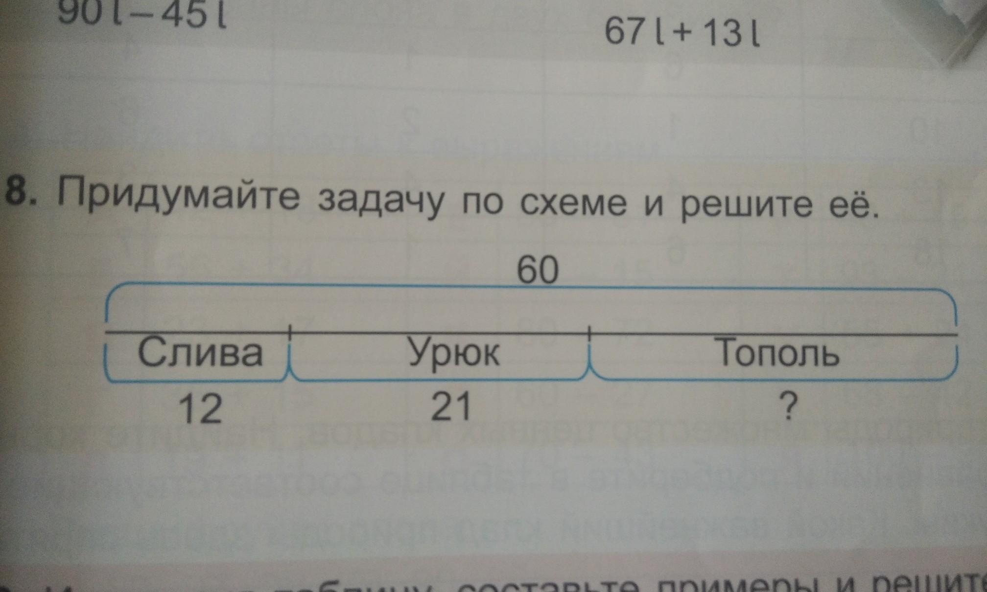 8. Придумайте задачу по схеме и решите её. 60 Слива 12 Урюк 21 Тополь ?
