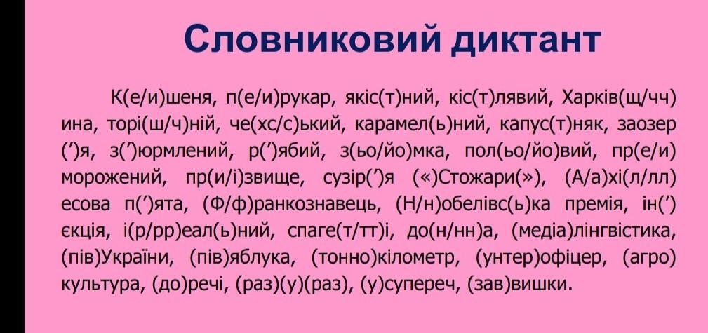 кИшеня,пЕрукар,якіСний,кісТлявий,ХарківЩина,торіШній,чеСький,карамелЬний, капуСняк,заозер'я,з'юрмлений,рябий,зйомка,польовий,приморожений, прізвище, сузір'я,Стожари,ахіллесова п'ята, франкознавець, Нобелівська премія, ін'єкція, спагетті, донна,медіа ленгвістика,пів України,пів яблука,тонно кілометр,унтер офіцер,агро культура, до речі,раз у раз, усупереч, заввишки