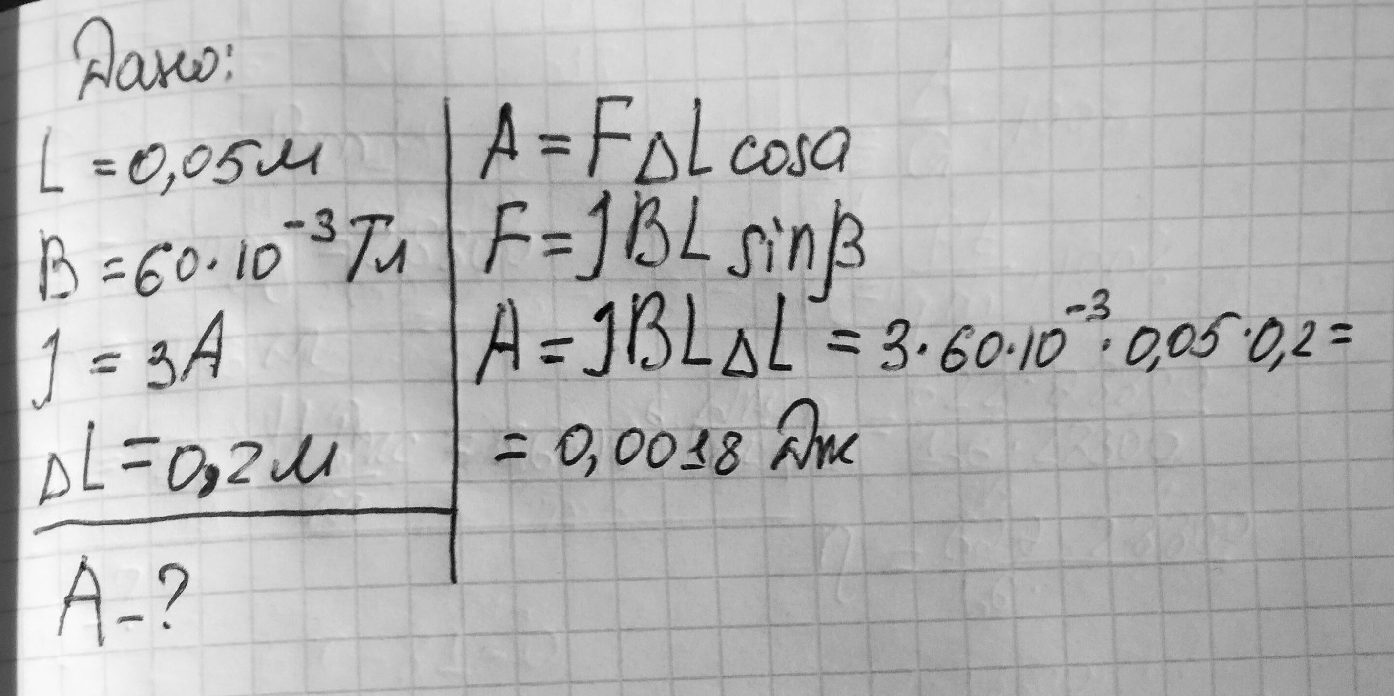 Провідник довжиною 5 см, по якому проходить струм 3 А, розмістили в однорідному магнітному полі, індукція якого 60 мТл перпендикулярно до магнітних ліній. Визначити роботу сили Ампера, якщо провідник перемістився на 20 см в напрямку сили. Повне розвязання. Даю 100 балів.