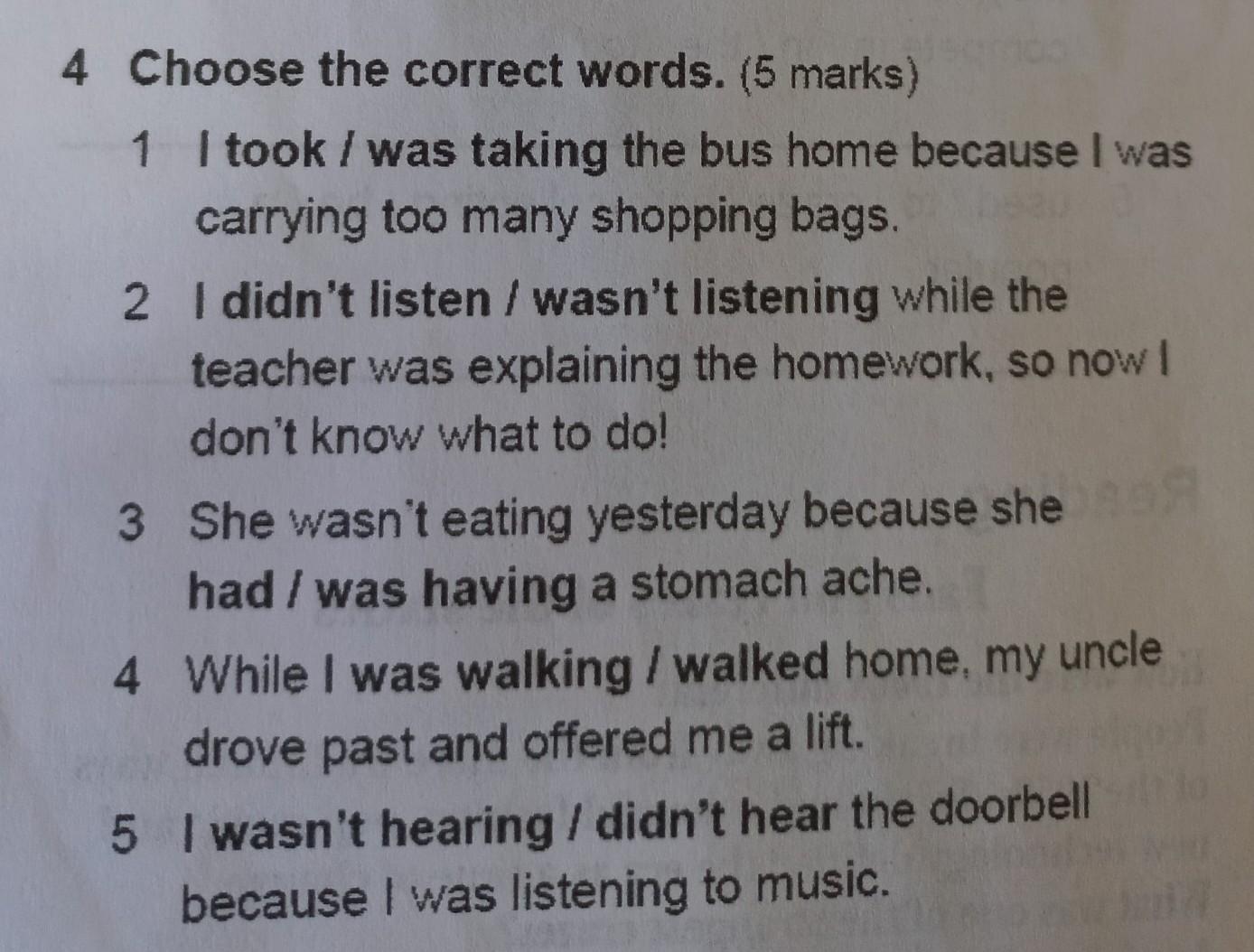 Language focus 4 Choose the correct words. (5 marks) 1 I took / was taking the bus home because I was carrying too many shopping bags. 2 I didn't listen / wasn't listening while the teacher was explaining the homework, so now I don't know what to do! 3 She wasn't eating yesterday because she 89) had / was having a stomach ache. 4 While I was walking / walked home, my uncle drove past and offered me a lift. 5 I wasn't hearing / didn't hear the doorbell because I was listening to music.