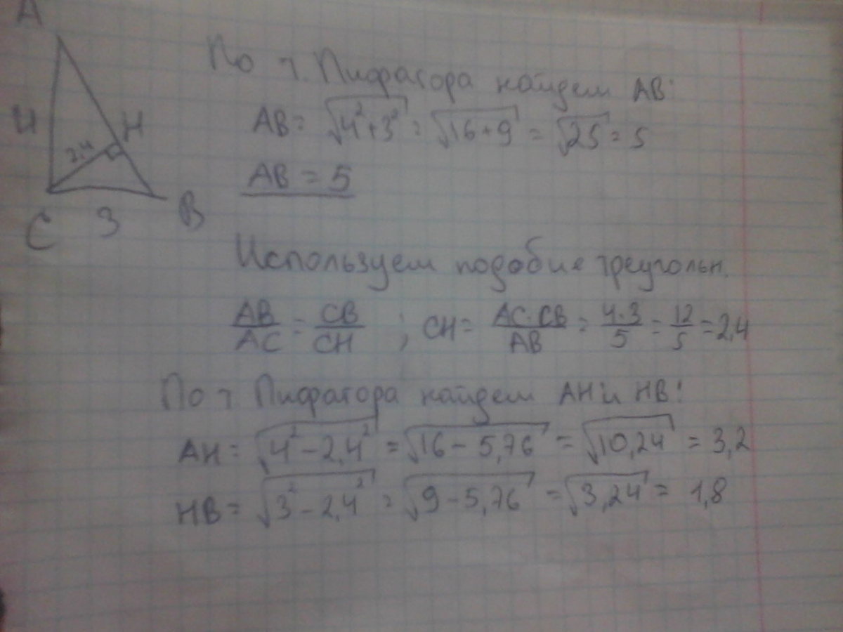 В прямоугольном треугольнике с катетами 3 и 4 опущена высота на гипотинузу. Найдите эту высоту и откезки, на которые она делит гипотенузу