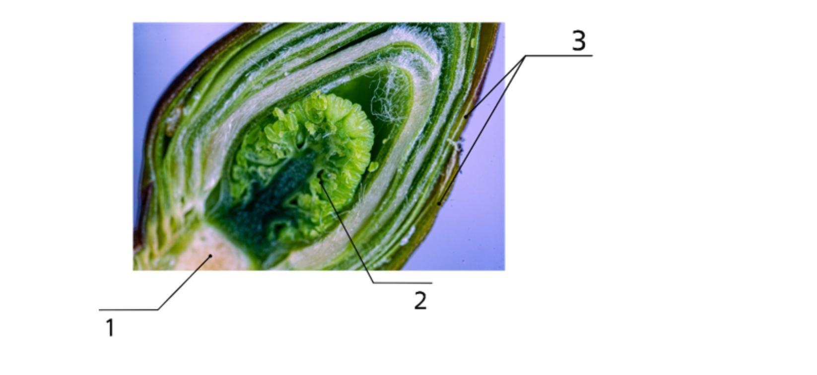 Рассмотрите микрофотографию нераскрывшейся генеративной почки. Что на фотографии обозначено цифрами 1, 2, 3 (18 баллов)?