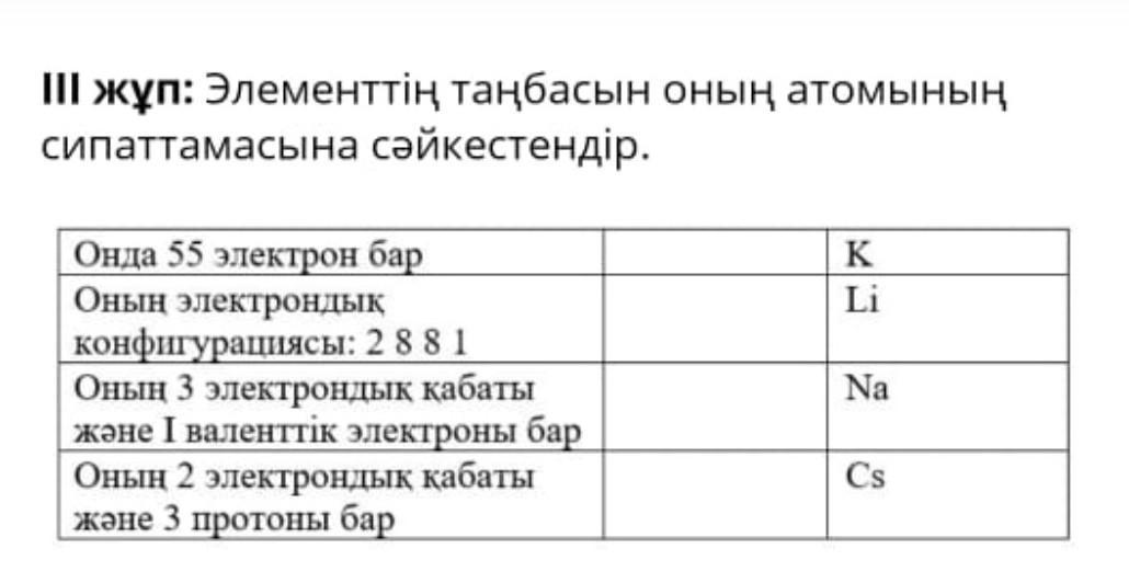 жұп: Элементтің таңбасын оның атомының сипаттамасына сәйкестендір. K Онда 55 электрон бар Li Оның электрондық конфигурациясы: 2881 Na Онын 3 электрондық қабаты және І валенттік электроны бар Оның 2 электрондық қабаты Cs A және 3 протоны бар
