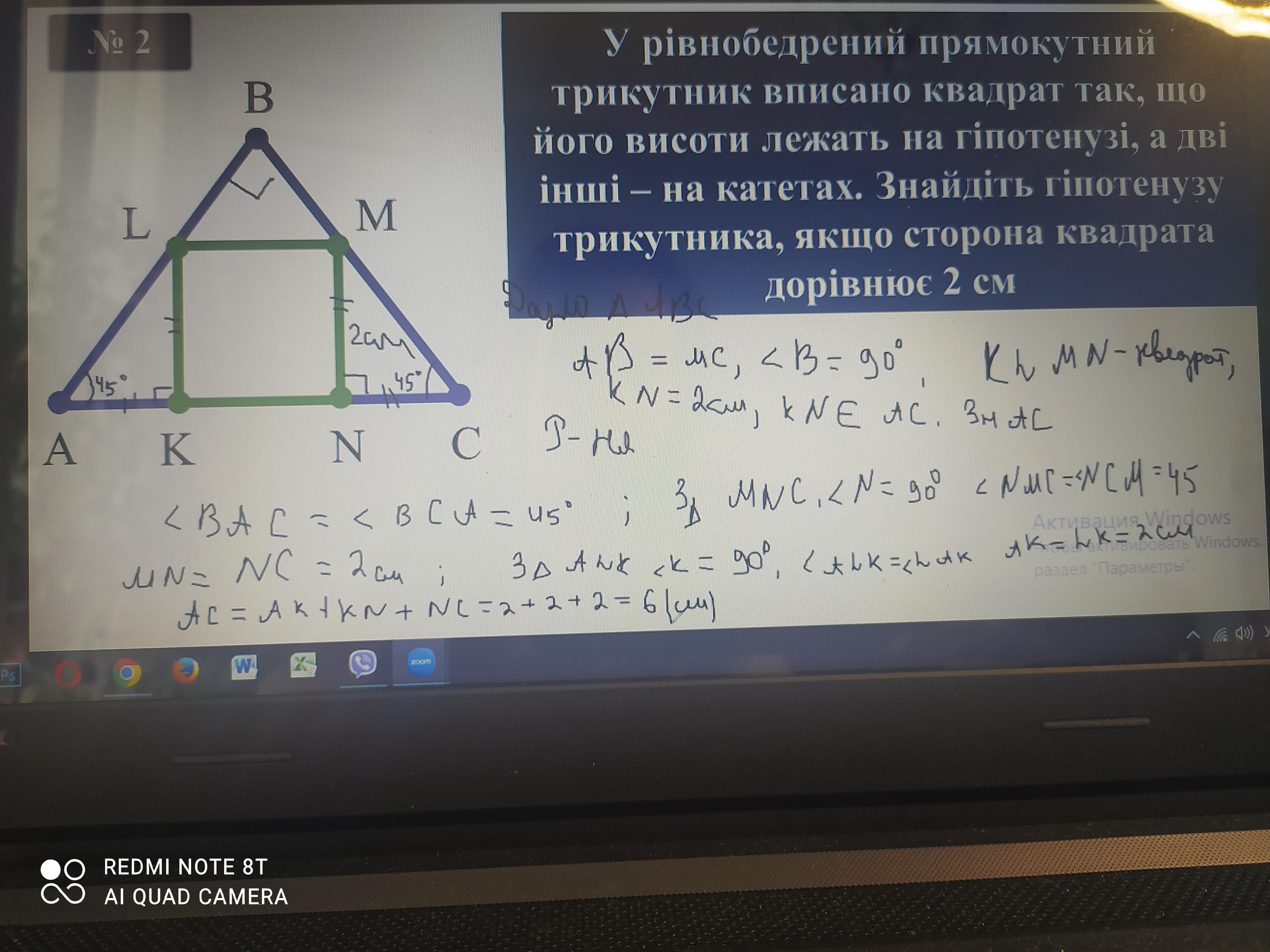 У рівнобедрений прямокутний трикутник вписано квадрат так, що його висоти лежать на гіпотенузі, а дві інші - на катетах. Знайдіть гіпотенузу трикутника, якщо сторона квадрата дорівнює 2 см