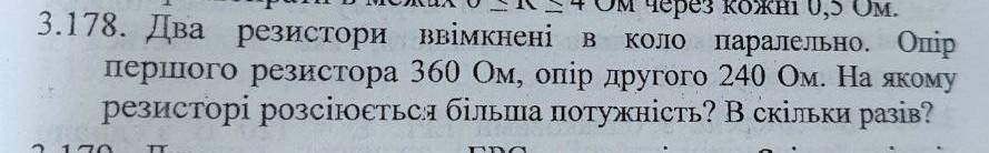 3.178. Два резистори ввімкнені коло паралельно. Опір B першого резистора 360 Ом, опір другого 240 Ом. На якому резисторі розсіюється більша потужність? В скільки разів?