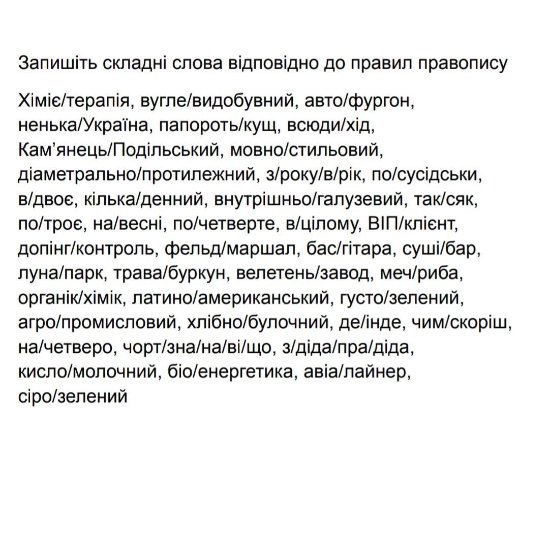 Хімієтерапія, вугледобувний, автофургон, ненька-Україна, папоротькущ, всюдихід, Кам'янець-Подільський, мовностильовий, діаметральнопротилежний, зrokuvrik, посусідськи, вдвоє, кількаденний, внутрішньогалузевий, таксяк, потроє, навесні, почетверте, вцілому, ВІПклієнт, допінгконтроль, фельдмаршал, басгітара, сушібар, лунапарк, травабуркун, велетеньзавод, мечриба, органікхімік, латиноамериканський, густозелений, агропромисловий, хлібнобулочний, деінде, чимскоріш, начетверо, чортзнанавіщо, здідапрадіда, кисломолочний, біоенергетика, авіалайнер, сірозелений.