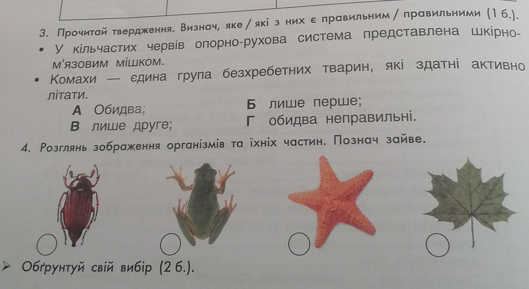 3. Прочитай твердження. Визнач, яке / які з них є правильним / правильними (1 б.). • У кільчастих червів опорно-рухова система представлена шкірно- м'язовим мішком. • Комахи літати. - єдина група безхребетних тварин, які здатні активно A Обидва; В лише друге: Б лише перше; Г обидва неправильні.